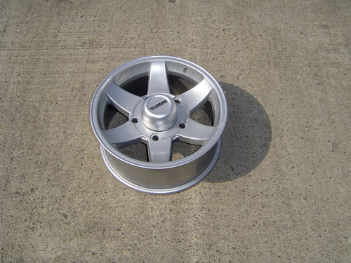 7x16 COMPOMOTIVE (obr. 3), jeden nový, 5x použitý. Nový za 3000,-, Použité byly chemicky zbavené vrstev barev a nastříkané. Cena použitých nově nalakovaných 18000,- včetně sady zrenovovaných matek. Tato kola jdou i na Santana PS-10, LR Series a starší provedení Defendera do r.v. 1992