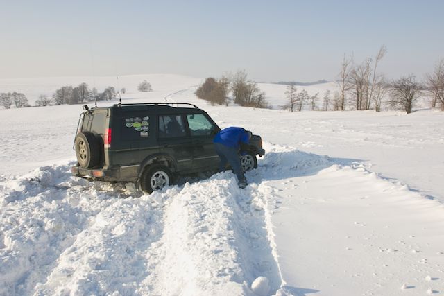 Sníh je zákeřnej, ale nevadí, ale ten led pod ním, ten mě dostal. Nemaje řetězy se auto sice prohrabalo až na hlínu, ale nebylo schopné vyskočit na 10cm vysokej led, protož už to klouzalo trošku moc. Každopádně kamarádům děkuji za vycuknutí, tentokrát na to lopata, kterou jsem stejně sebou neměl, nestačila.