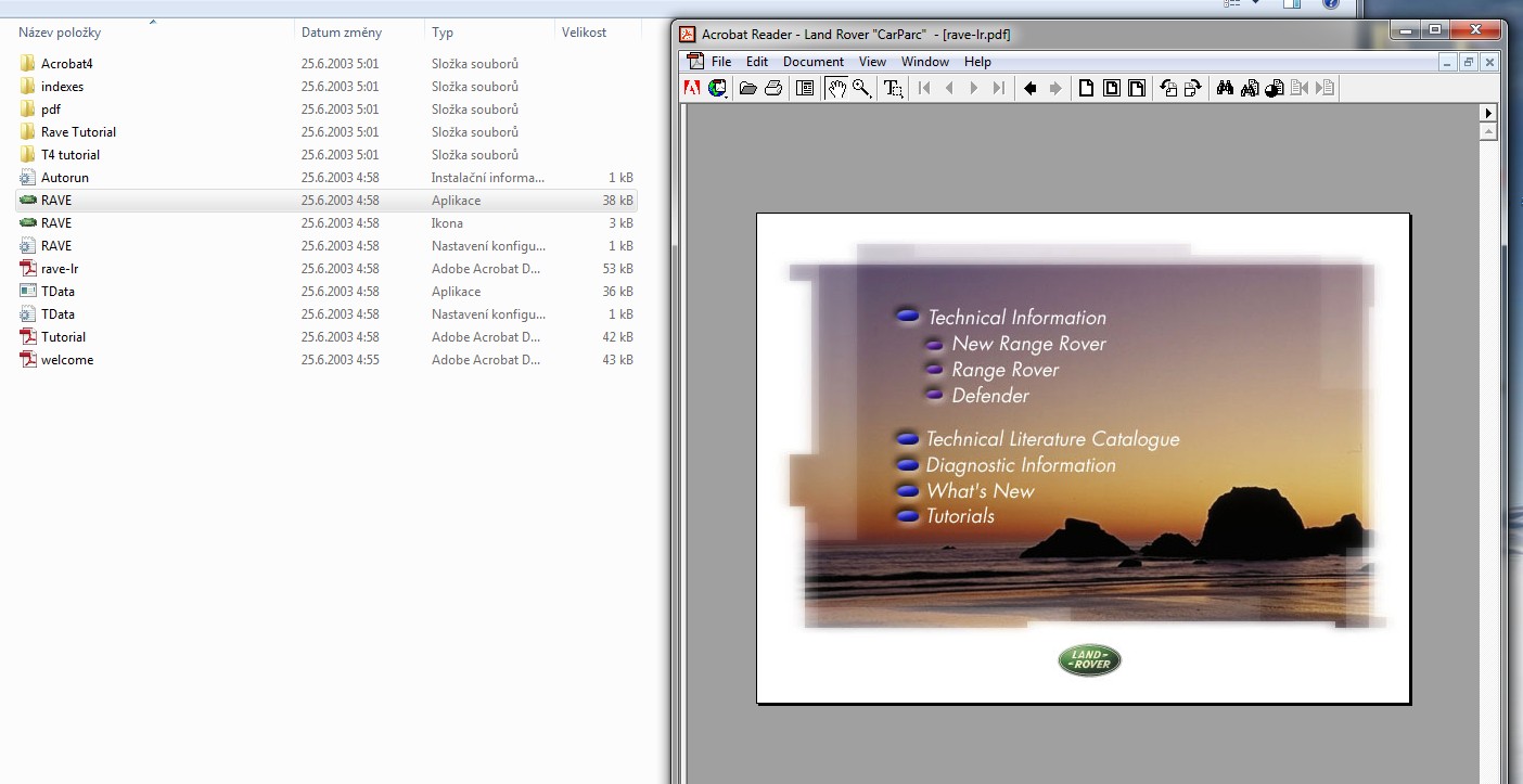 Klikneš na tu ikonu "RAVE" typu aplikace velikost 38kB a pak se to otevře .pdf, co je vidět vpravo, pak už jen "Defender"-> vlevo nahoře "Workshop manuals"-> tvůj model-> v levém menu kapitola "76 - Chassis and body"