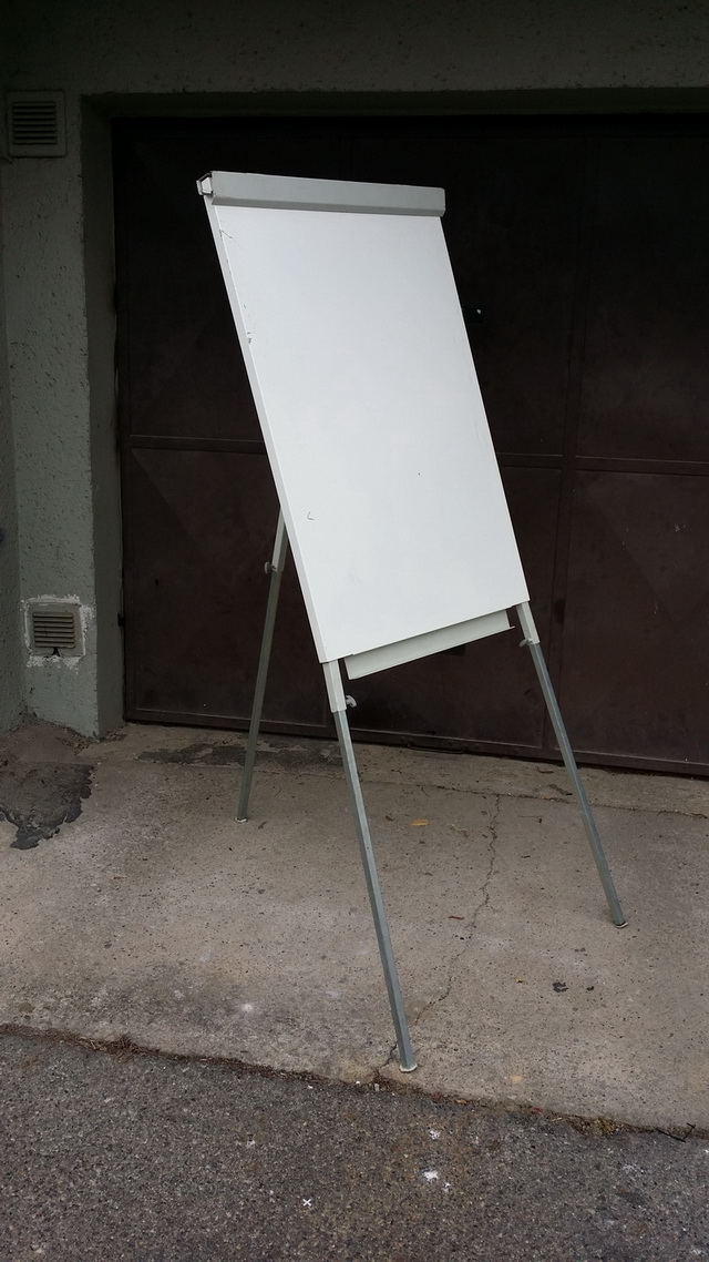 5) Flipchart - tabule výškově nastavitelná, skládací. Rozměr plochy 70 x 105 cm, max výška 180 cm. Popisovatelný magnetický povrch, horní klips na papírové bloky, boční výsuvná ramena. Cena 750,- Kč