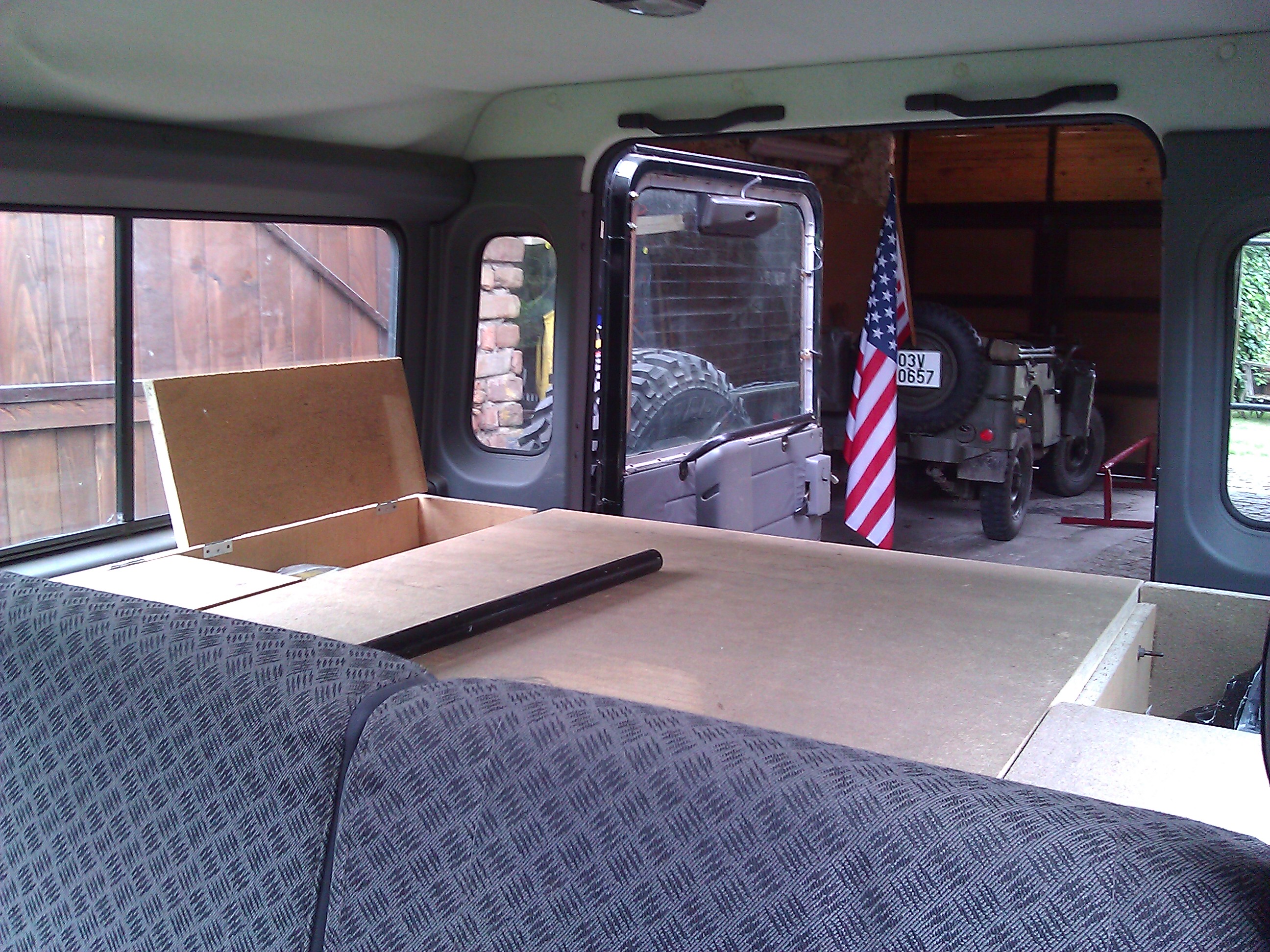 Tak sem se do toho taky pustil. Nutno uznat že prvně sem si myslel, že v pondělí začnu a v sobotu už budu na fesťáku spát v autě. Teď je konec září a to znamená už druhej měsíc od začátku. S přestávkama po večer a odpolednách sem na tom strávil dost času. No.....k věci. Celý je to 2cm tlustá dřevotříska, inspirace Rosomák a LubošM tedy bedny na blatníkách místo lavic. Mezi nima deska až po zadní sedačky. Zadní sedačky lze za jízdy používat a pro spaní se na ně dává dělená deska opřená o tyto složené sedačky. Celý natřený černou matnou, zvrchu polepený kobercem. Mimo to že sem si vyřešil ložnici do auta, tak sem zlikvidoval cajk v bedně v kufru, lékárničku, vestu, lana, šekly a kurtny pod sedačkou všecko do těch super beden.
