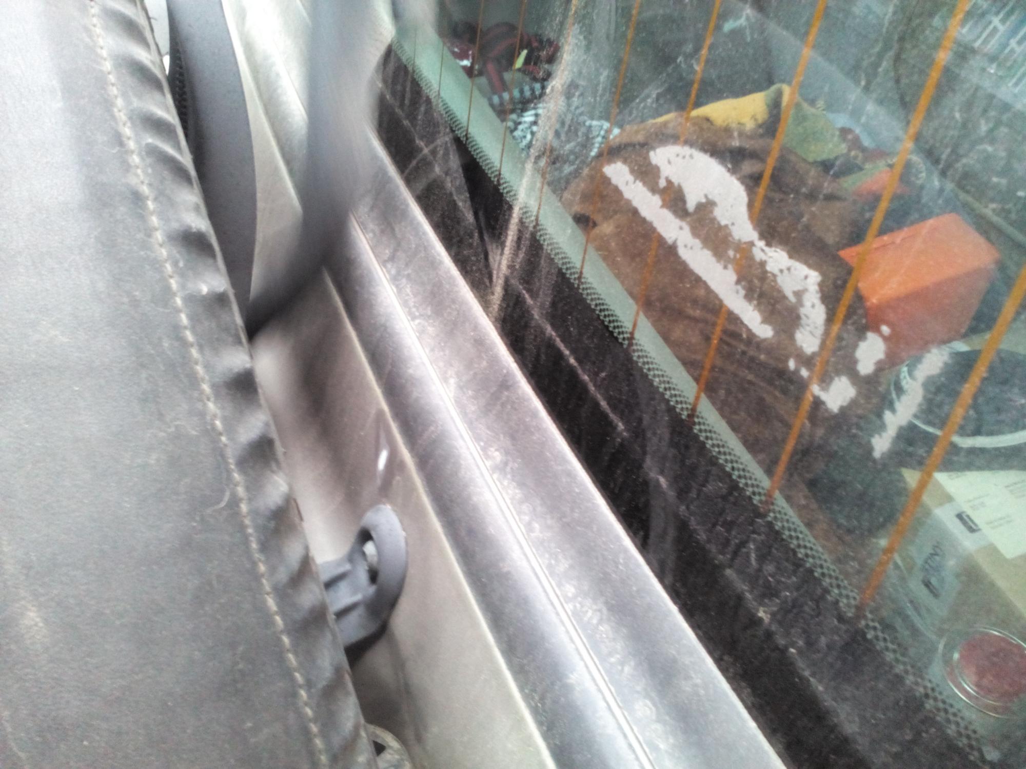 Chce to nový ramínko stěrače... Ono se asi časem prostě prověsí a zavazí o dveře. Originál ramínko. Kupoval jsem náhražku z polska (ebay) a silně nedoporučuji... Jednak tam byla krátká hadička k ostřikovači, takže ať jsem to dal jak jsem chtěl, tahal se celý šlauch přes uchycení stěrače k motorku. Jednak tam bylo slabší pérko, takže to ani pořádně nestíralo, starší péro nešlo použít vzhledem k trošku rozdílnýmu provedení origo vs. polskýho stěrače. Ani trysky nebyly stejný... Navíc po několika pokusech nandat a sundat ten stěrač polskej se jednoduše v tom ohýbacím spoji zlomil... Zatím jsem tam dal samolepku aby se dveře nedřely ještě víc a jak budu objednávát oleje, přihodím k tomu nový ramínko stěrače za cca 600...