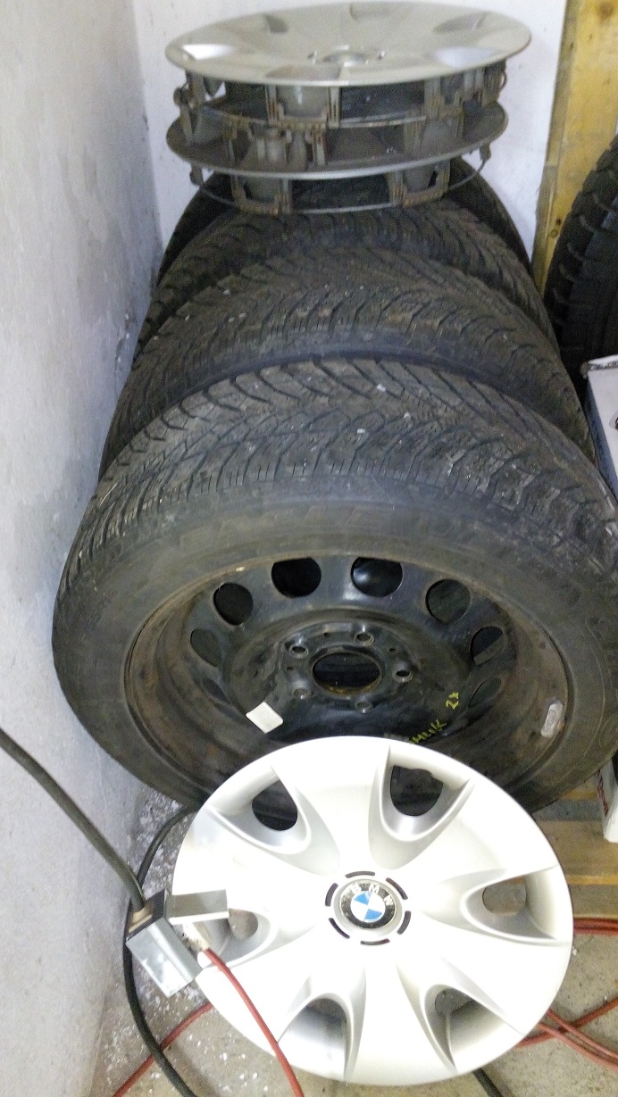 4xplech.disk 7Jx16,povchová koroze sem tam,origo BMW+poklice,obuty ranflety 195x55x16 cca 6mm zimní.Stáří 8let.Nebouchlé.Jestli najely v zimně za celou dobu 10tis.tak je to moc.Manželka moc v zimě nejezdí.Na nové auto ji nepasují,zavazí.cena 4tis.
