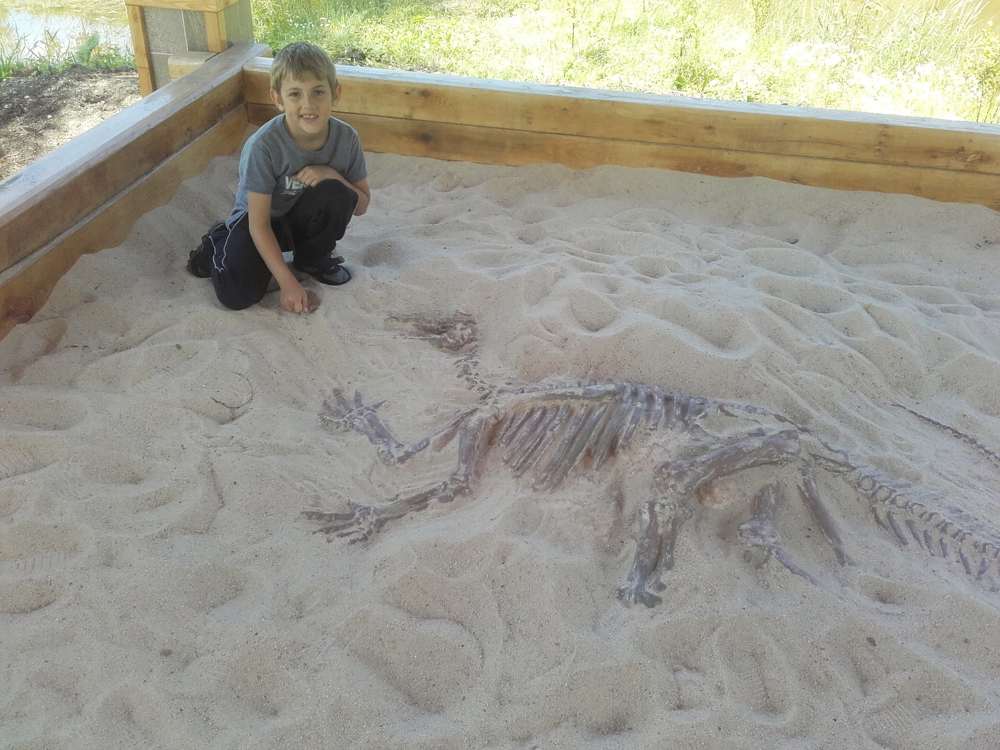 A protože máme děti rádi,tak doporučujeme aby si ti menší vzaly s sebou lopatičku a štěteček. Budou moci totiž archeologicky odkrývat kostru dinosaura: