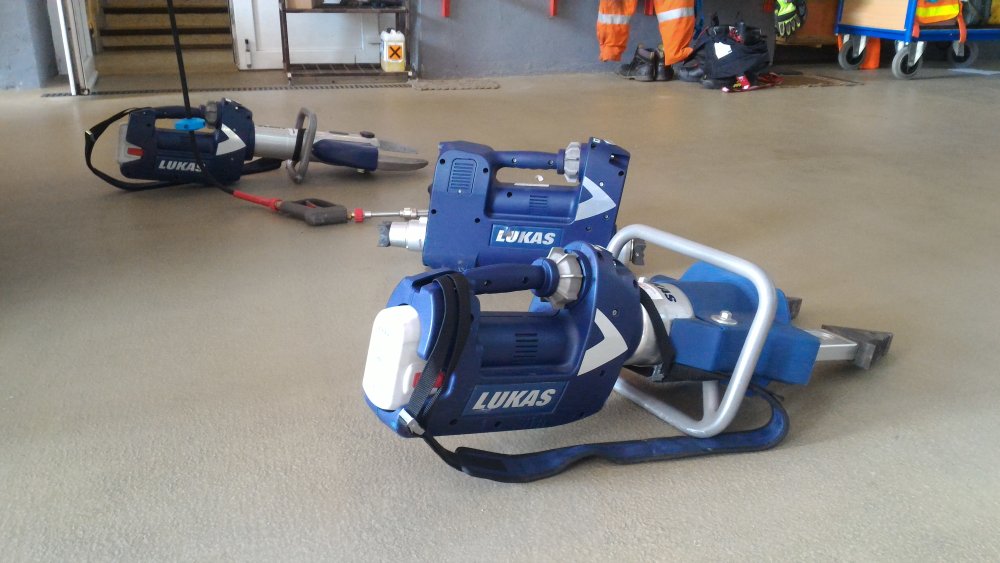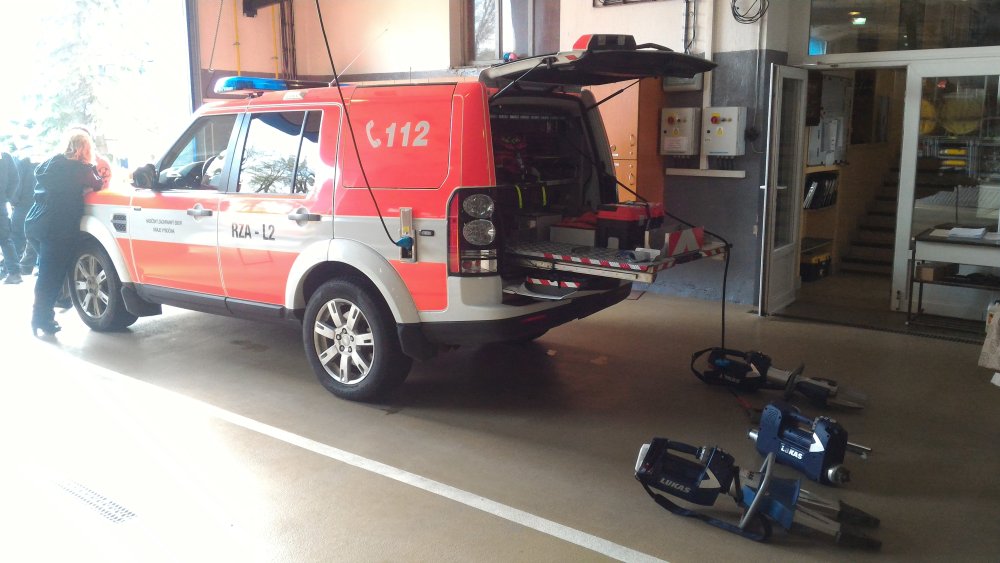 Ta hadice vzadu není od hydrauliky, ale k proudnici. Hydraulické nůžky a roztahováky za autem fungují na akumulátory. Nejsou závislé na hadici, ale jsou prý těžší a neohrabanější, protože jsou také delší o motor. Takže není tak úplně jasné, zda jde o přínos. Ale na tu malou AKU zvládnou až 20 minut roztahovat silou 40t a nůžky u čepu stříhat 70t.