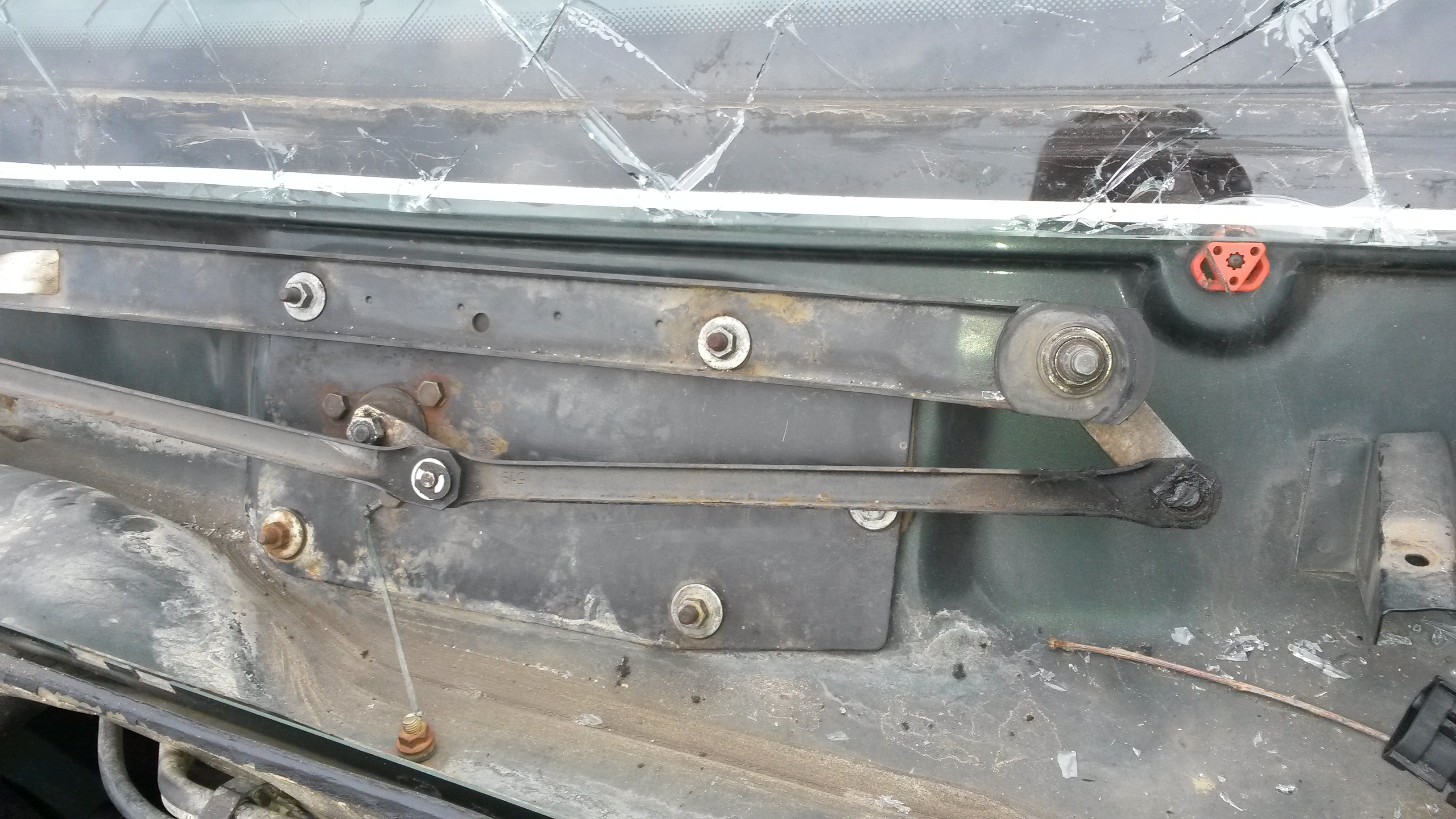 Až budete sundavat těch pět matek, co drží ten mechanismus v kastli, tak zjistíte, že jsou to 4 matky a jeden šroubek. Ten šroubek je jakoby pod táhlem k levému stěrači a ikdyž si můžete volit polohu toho táhla (pustit stěrače a stopovat je tak, že vypnete klíček v zapalování) nakonec zjistíte, že všechny polohy táhla jsou na hovno. Pokud si necháte ten šroubek jako poslední tak vzhledem k získané vůli, jde vyndat docela dobře - to je třeba mít na paměti až to budete dávat dohromady, protože to je třeba tím šroubkem začít - protože pokud napřed dotáhnete ty 4 matky, tak už tam pak ten šroubek nedáte.