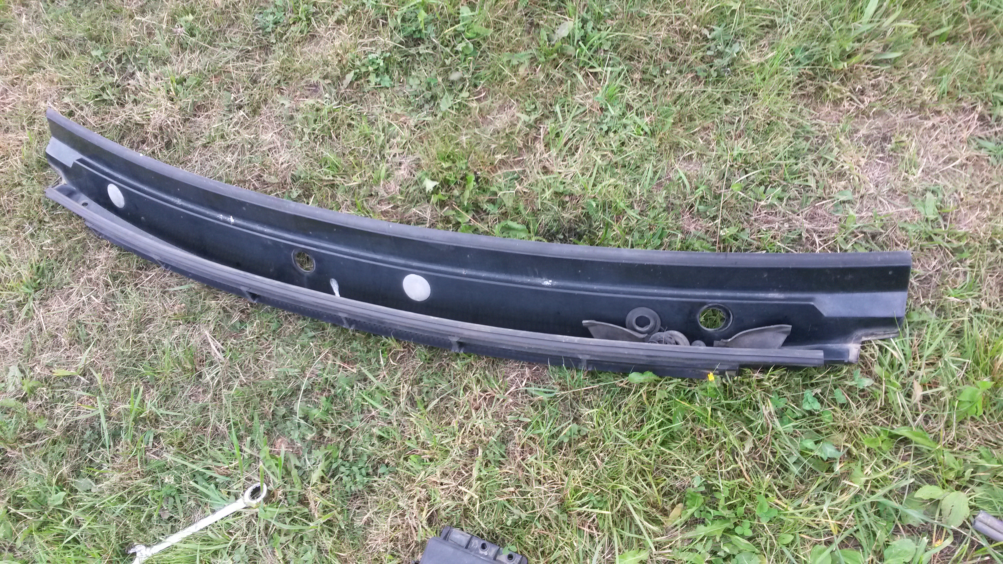 Prvně pokud člověk chce k tomu mechanismu stěračů, je potřeba zahodit kapotu. Zkoušel jsem to s otevřenou zavřenou, postě ty 4 šrouby odšroubovat a kopotu dopryč. Pak už je ten plast pod oknem celkem rozumně přístupnej, kromě samotných stěraču je v tuto fázi potřeba sundat ty velké matky, co jsou pod stěračema (devatenáctka klíč, nebo tak něco). potom ten plast drží na dvou plastovejch šroubkách po stranách a jednom opravdovým prostřed, pak to chce citlivě vytahat takové gumové hajzlíky po stranách a pak už to jde sundat - ten plast. Nepolámat!