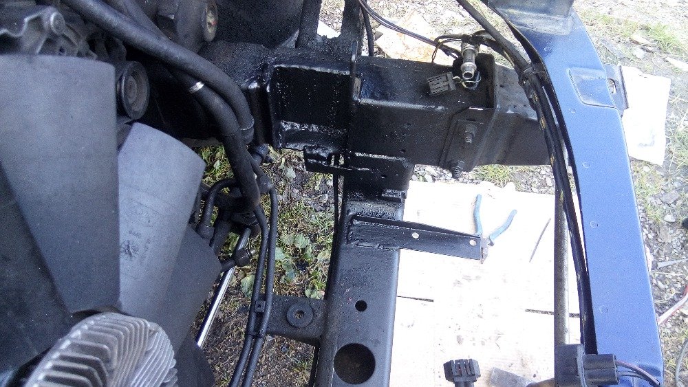 Jo,ještě jsem zapoměl,na fotkách nebude vidět,ty spodní plastový držáčky se provrtaj a přišroubujou na vršek nosníku v místě výřezu,do nich sedne chladič těma gumovejma špalíkama a výškově to vychází přesně,horní držáky už na fotkách budou vidět.