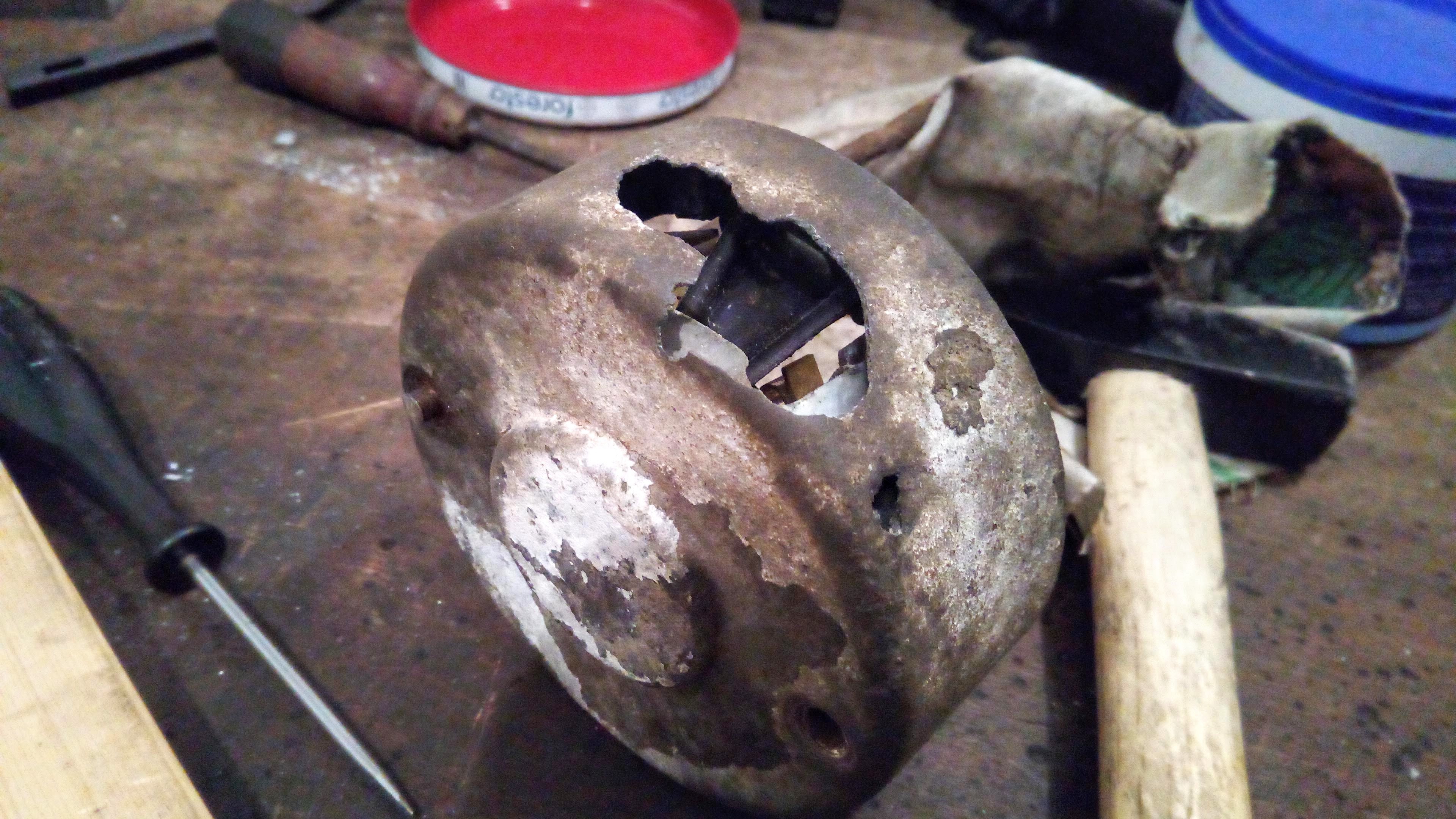 Sundat uhliky z krytu som primarne chcel kvoli oprave samotneho krytu. Po havarke v nom bola prasklina, ktora reagovala na mierne potukavanie samovolnym rozpadom, takto to vyzeralo po odrypani toho co slo, este pred celkovym cistenim a odhrdzavenim