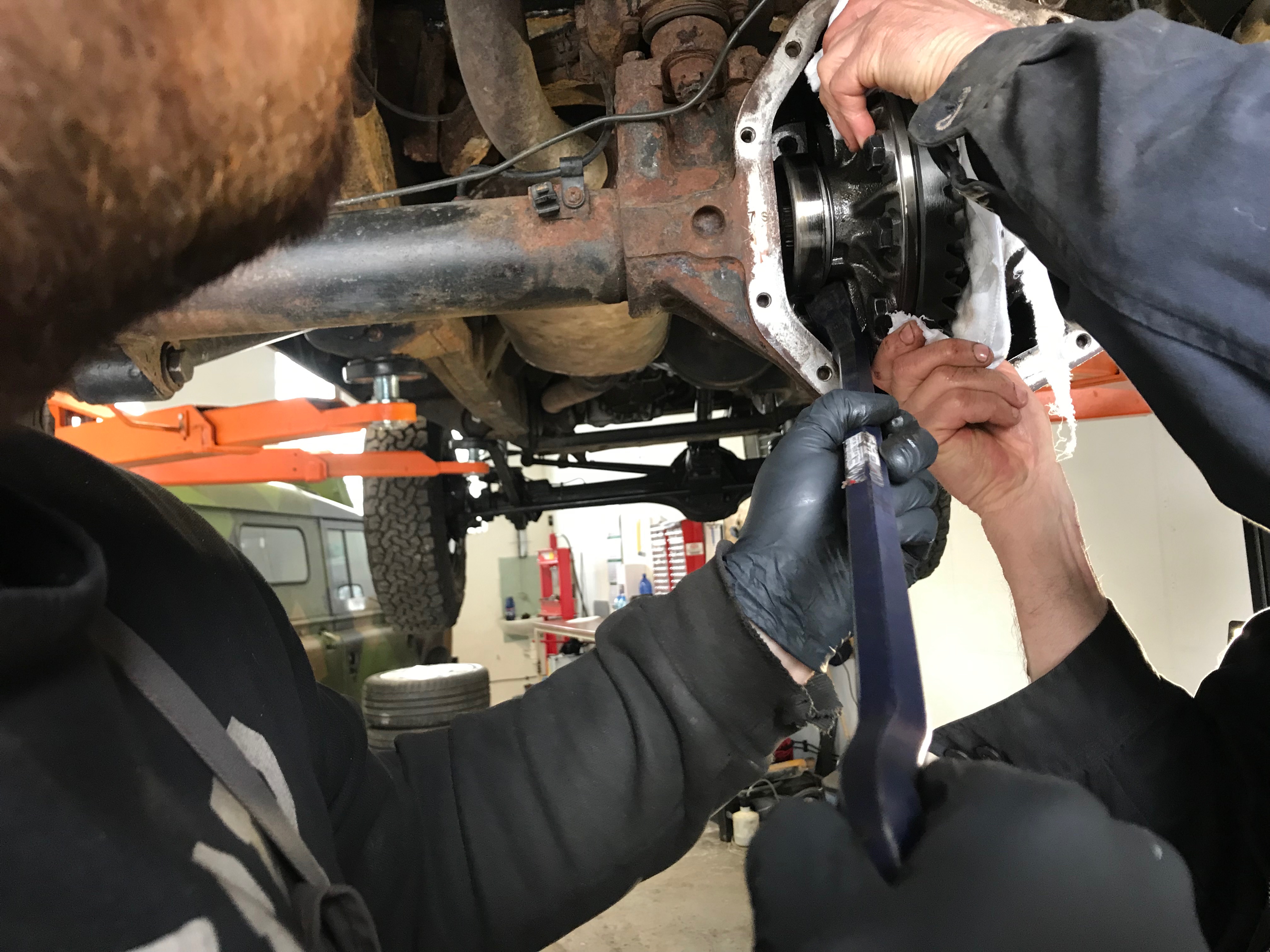 Tenhle systém Salisbury nápravy je americkej - koukni se po videích s nápravou Dana. Rozumné řešení bylo nápravu ven, pěkně do držáků na stole a potom si hrát. Takže něco jako přichycení obalu diferáku do velkého svěráku bohužel nejde.