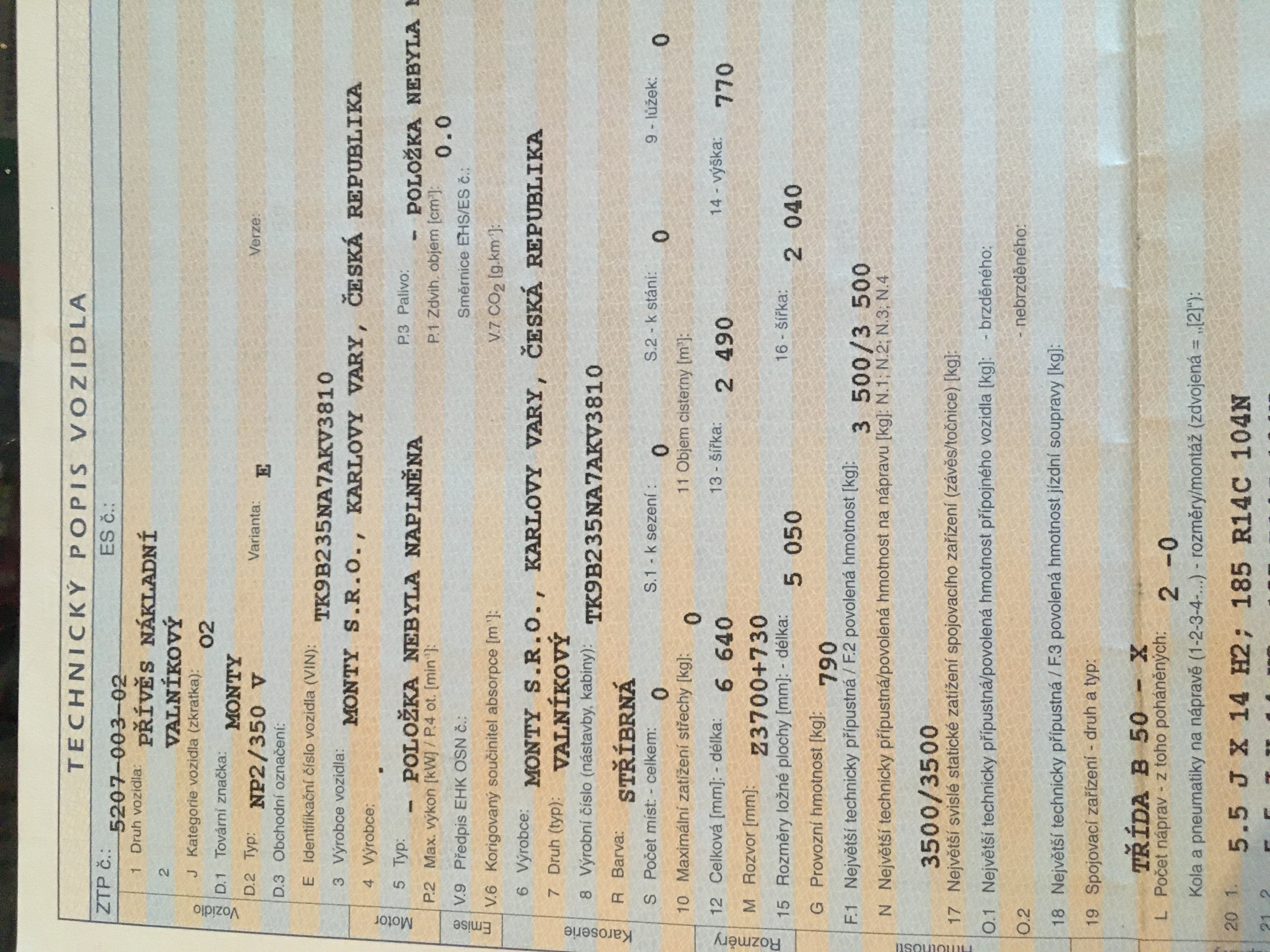já mám taky 3,5 t - pecival z úřadu napsal F1 ( přípustná ) 1750 a F2 ( povolená ) 1750, prostě se seknul "jenom" o řádek t.j. hmotnosti na nápravu N ( musel chudák vypsat nový TP ) - vše v pohodě, ale jenom do prvního průseru, potom se pojišťovna neptá a neptá se ani na nosnost gum. prostě na plaťáku mám "c 108 = 1000kg " a na podvalu taky "c 84 = 500 kg ( celková 2000 kg ) a samozřejmě zapsaný. ale vlek je to hezkej, užitnou hodnotu tím, že má plný plato má vysokou, stará poctivá práce - ten se prodá...