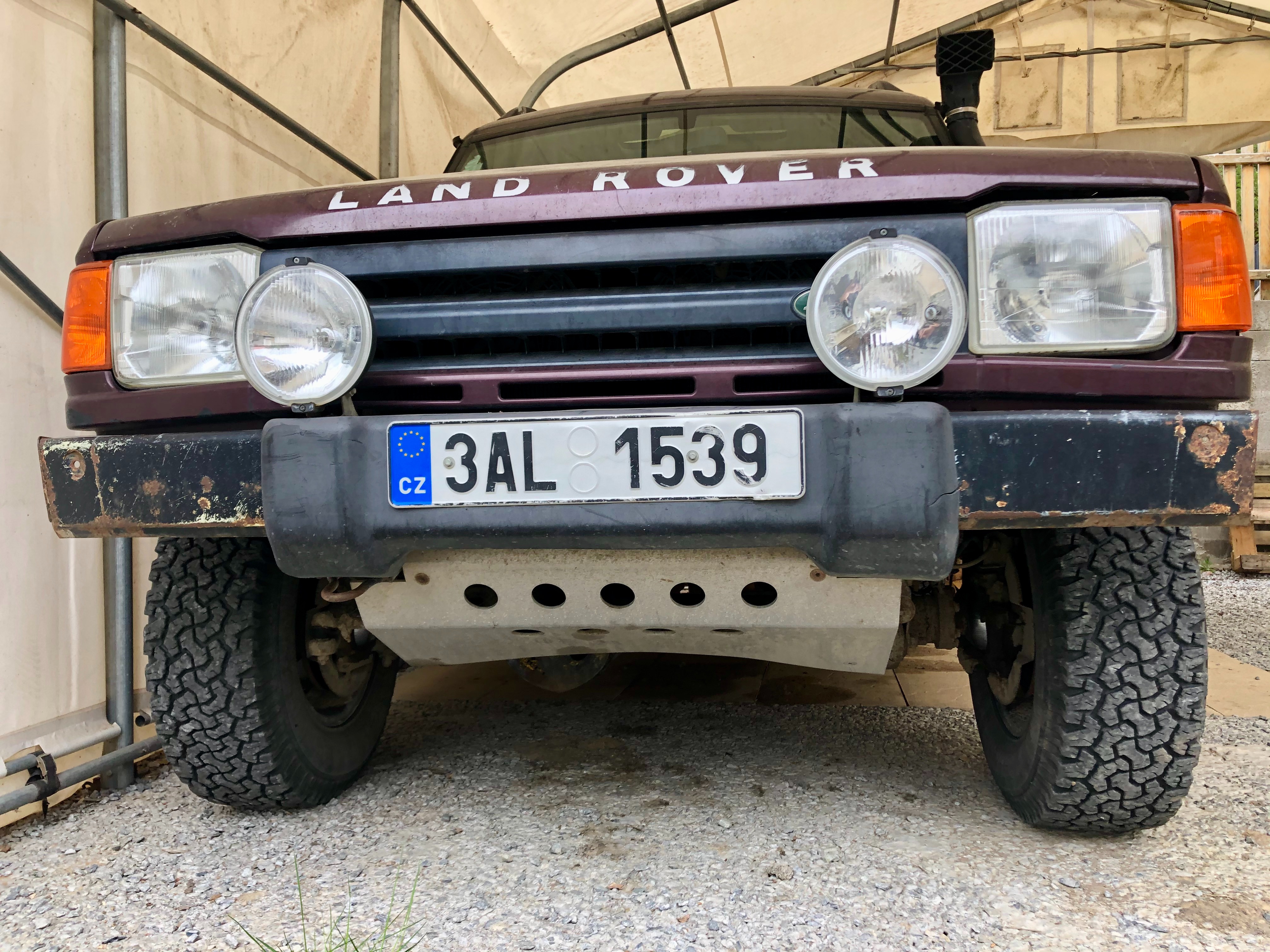 Auto bylo kdysi přivezeno z CH. Byl do nej instalovaný plyn, který já jsem nechal vyhodit a jezdil jsem normálně na benzín. Předchozí majitel auto zvedl, dal tam pěkná velká kola, pevnostní prahy, sání atp. Na fotkách vypadá lépe než ve skutečnosti. Pro mě to byl dělník a dost jsme s tím řádili v terénu. Rám je celkem OK, ale v podbězích je to rezavé dost. Auto je trochu otlučené a především poškrábané od větví. Pod autem se dělají fleky, kape to asi na více místech.