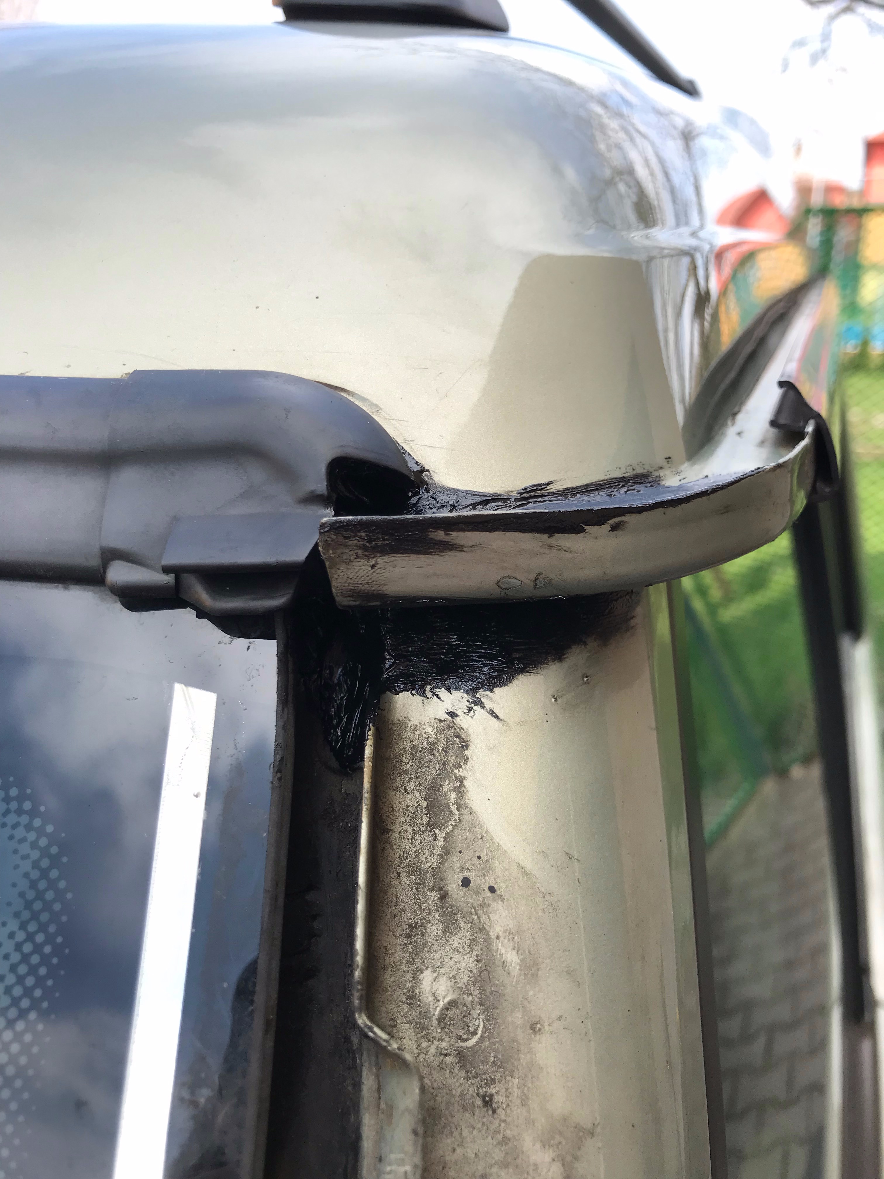 Ještě doplnuji fotky rohu předního sloupku kudy teklo (to jsem si všiml u více aut, že to tam praská). Docela by mě zajímalo, jestli ta kontrukce je oslabena otřesy nebo tam je nějaké pnutí, nebo něco jiného? Každopádně se zdá, že je to časté místo. (Vím, že se tam spojuje karoserie). Sundal jsem krycí plast a místo odmastil technickým benzínem (kam jsem se dostal) a zatmelil černým PU tmelem od Den Bravenu.