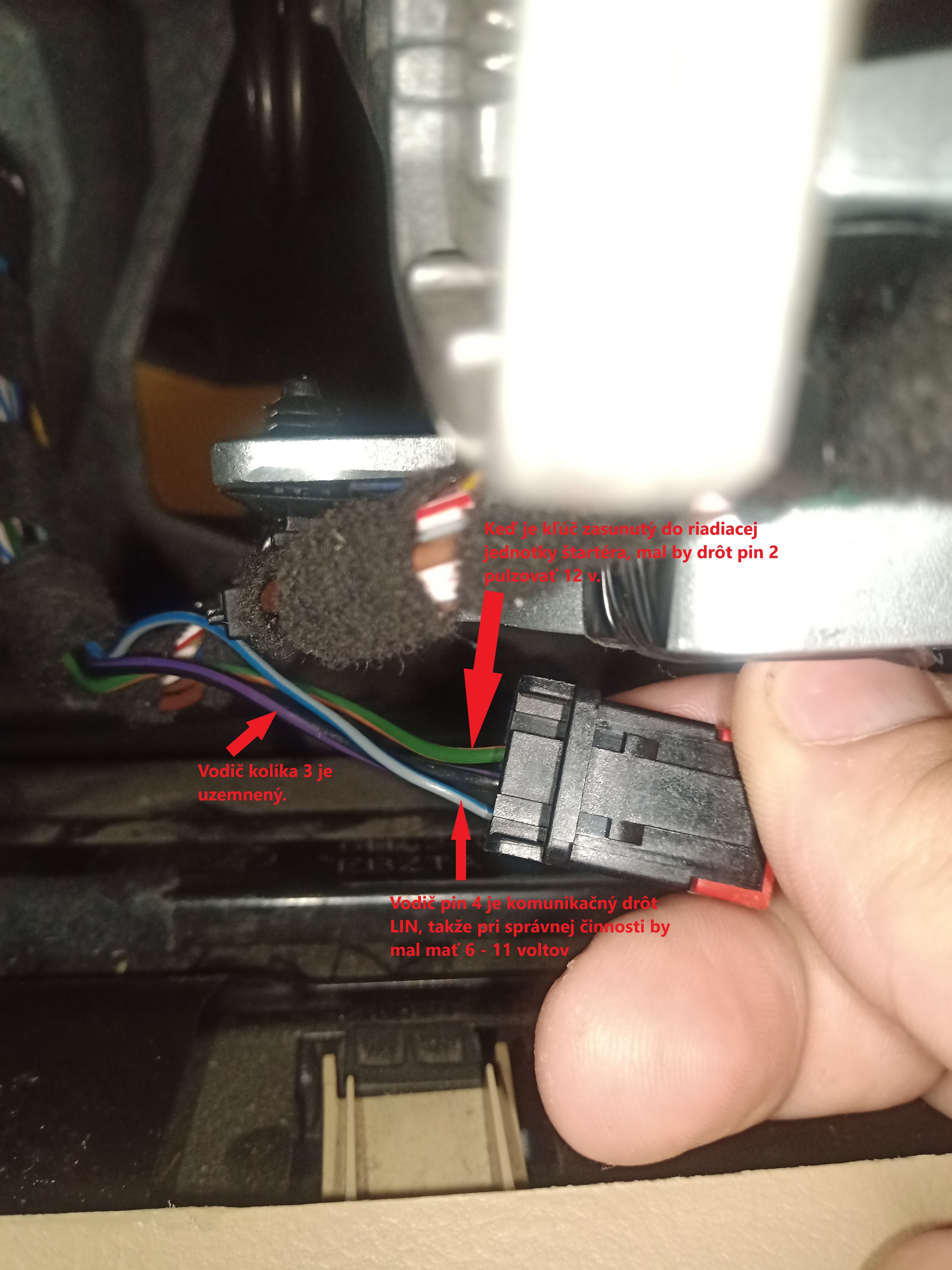 Pin 2 = zelený a oranžový drôt keď je kľúč zasunutý do riadiacej jednotky štartéra, mal by drôt pin 2 pulzovať 12 v