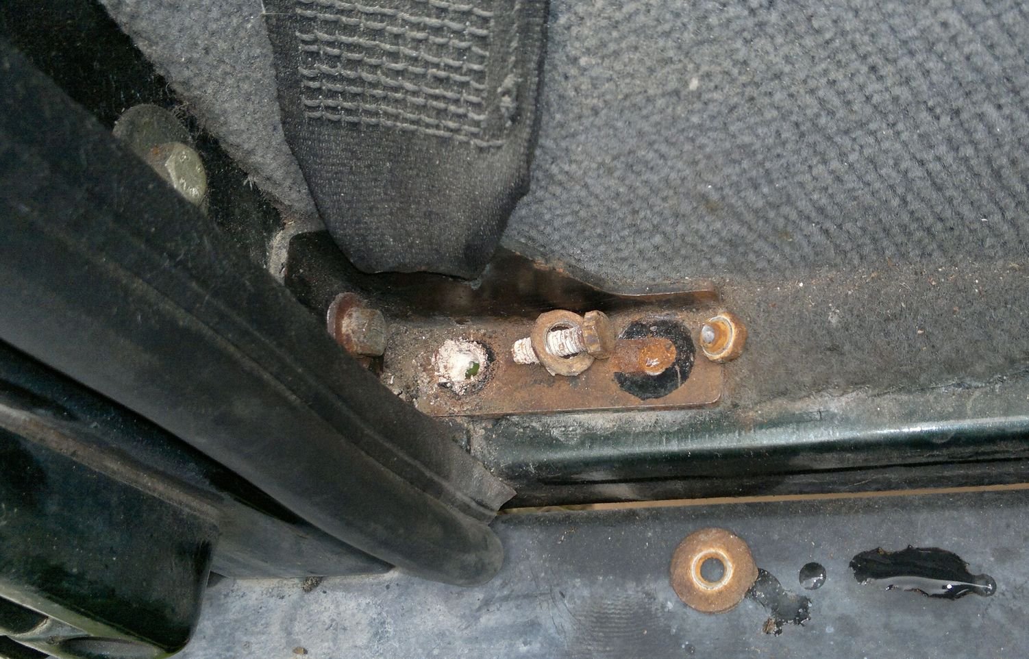 Jednou z odpočinkových prací o velkých prázdninách bylo i pořešení dalšího drobného detailu, který by mohl způsobit komplikace při STK - repas orezlých držáků předních bezpečnostních pásů. Ty prý bývají snadným cílem kontrolních techniků, teda hlavně u Anglánů, jak u nás nevím.