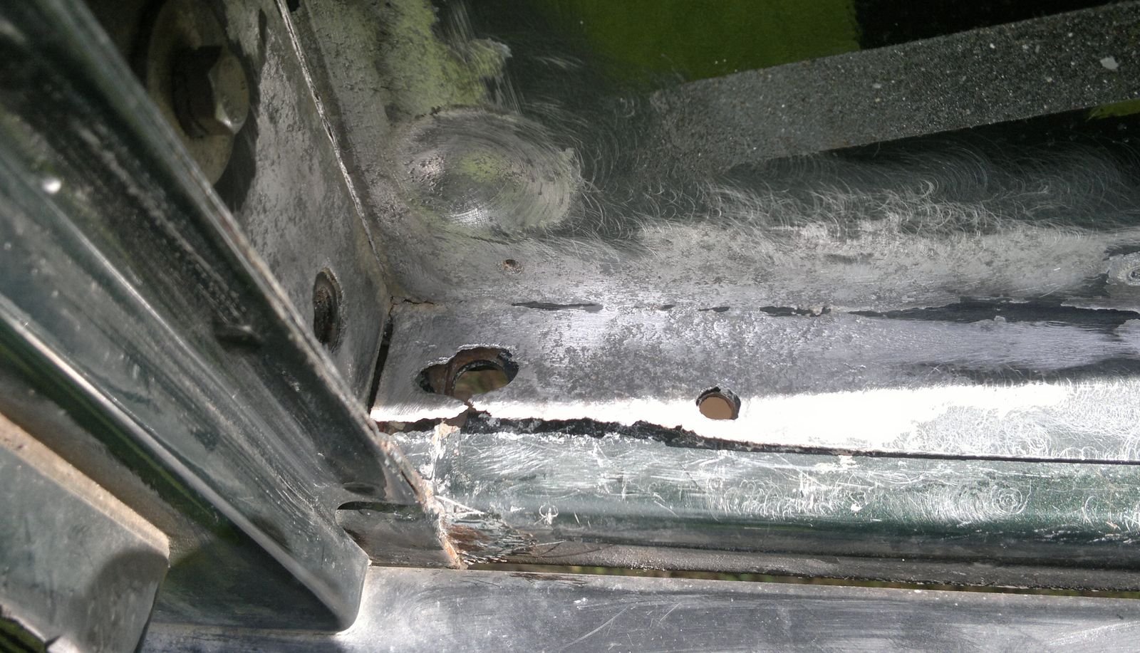 Protože držáky od pohledu opravdu vypadaly nevábně, tak jsem se rozhodl je odšrouboval a dát jim novou lakovou fazónu. Už povolení prvního šroubu slibovalo zábavu a hlavně odkrylo, že držáky nebudou jediná věc k řešení, protože se pod nimi začal objevovat typický hliníkový prach/pěna. Na povolení šroubů stačila již osvědčená metoda - nasadit ráčnu, zabrat a .....