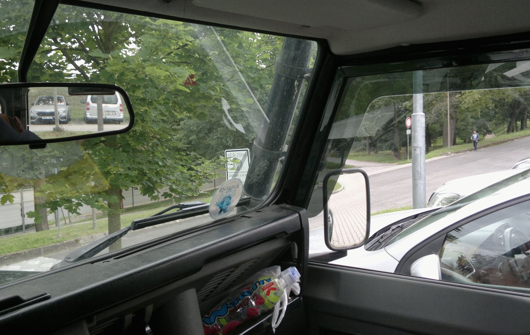 A teď to, co jsem nikde nenašel - jaký je s deflektory výhled. Je to focené z výšky očí. Měřím metrosmdesát. U řidiče je to v pohodě.