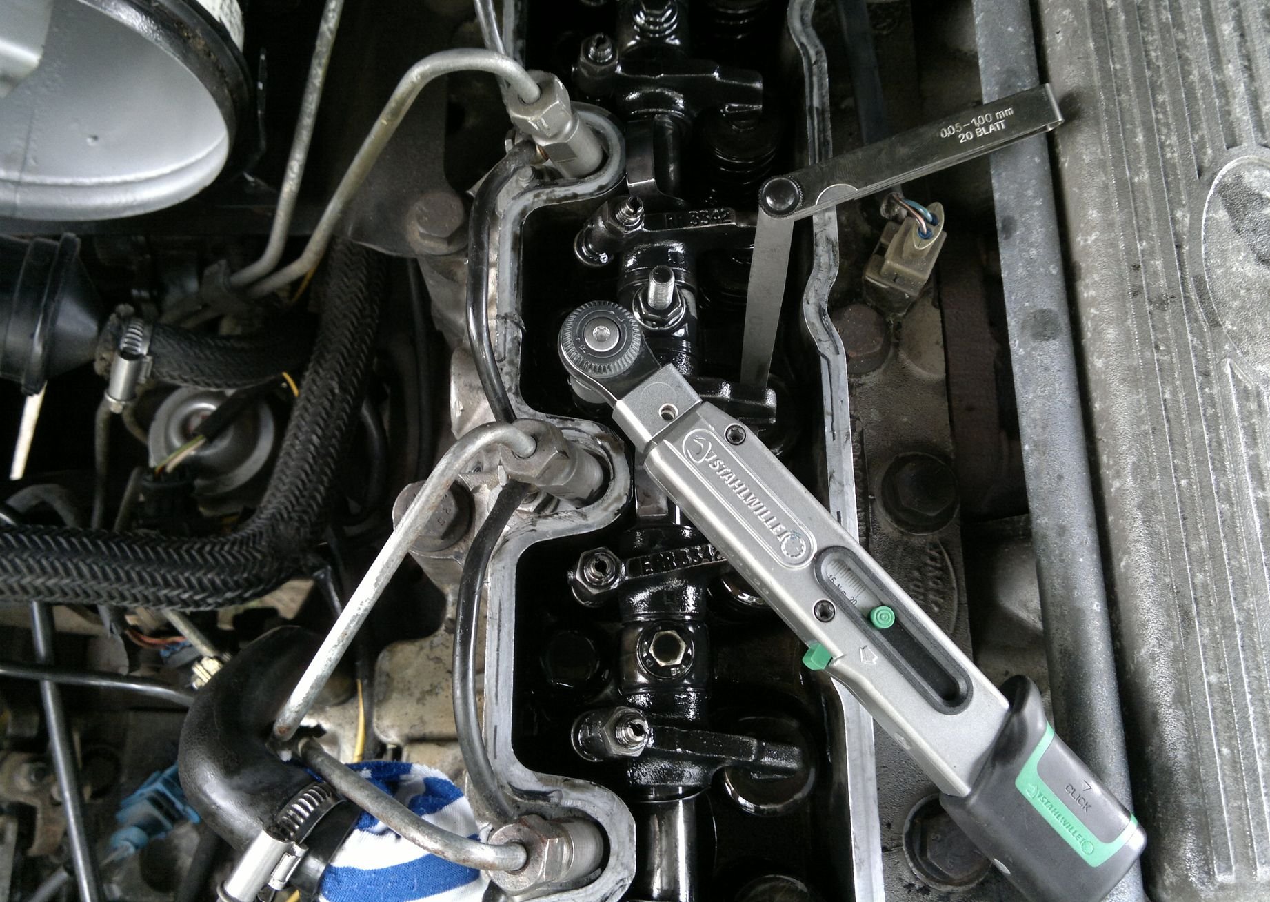 Potíže se objevily při utažení zajišťovací matice adjustačního šroubu vahadla na správný moment - má být 16Nm. Sice jsem použil malý momenťáček (rozsahem 4-20Nm kompletně pokrývá momenty vyžadované při této operaci), ale stejně tam bylo málo místa. Použil jsem nástrčkový klíč, abych mohl přidržovat šroub, ale z levé strany nebyl prostor na pohyb momenťákem, vadily palivové trubky a filtrbox. A z právé strany je zase matka moc utopená a vadí tam oblouk vahadla. Navíc matka je docela měkká a otevřený klíč, který mám na trubkové spoje jí "rozmazával". Nakonec jsem to holt utáhl vořechem bez přídrže a zkontroloval měrkou. Napříště bude asi dobré vyrobit speciální klíč z dlouhého vořechu s navařenou nástrčkou 9x12, aby šel skrz něj prostrčit šroubovák.