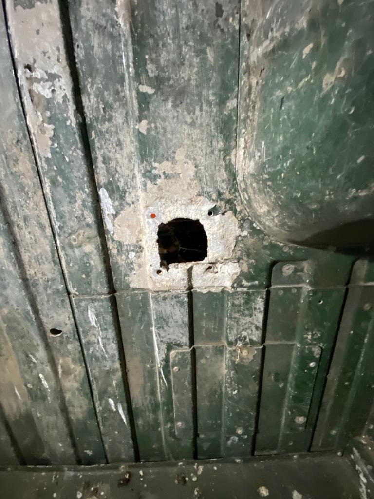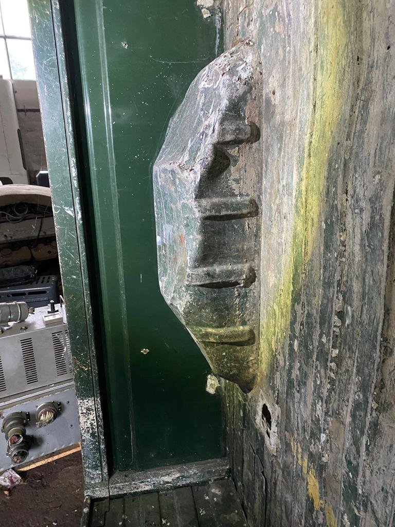 Fotky zde. Pravý bok bez poškození, levý má odřené místo u zadního rohu. V podlaze 4 díry po vázacím oku.