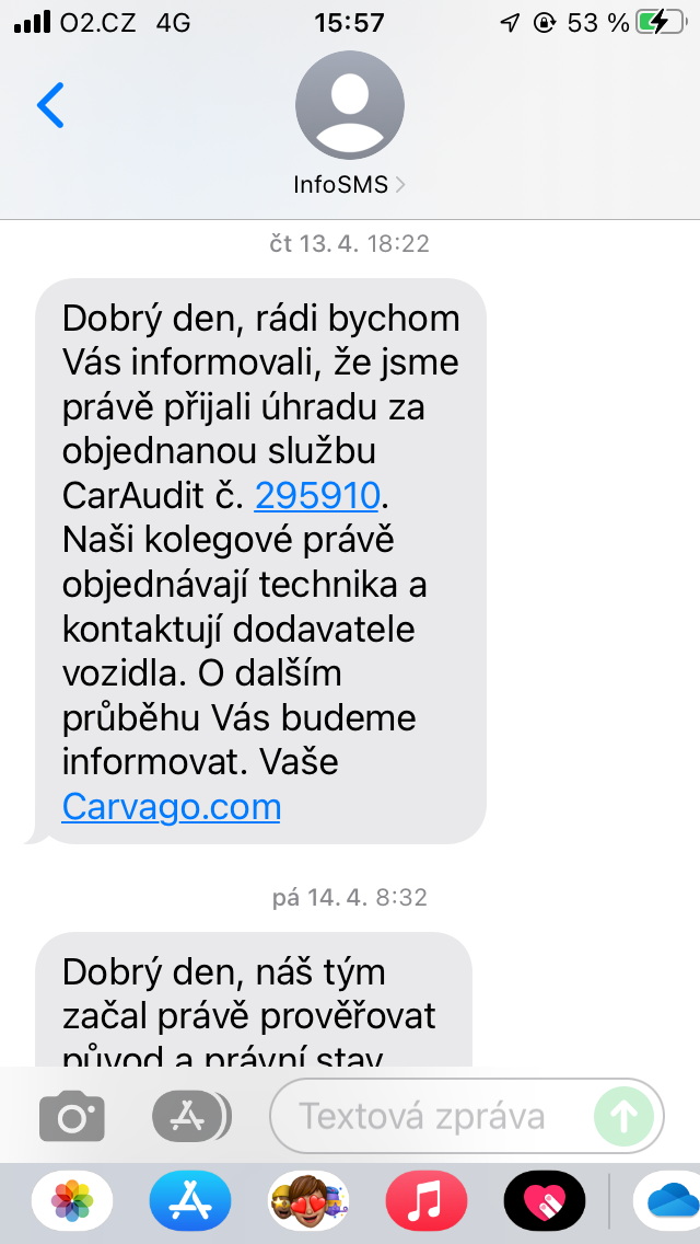 Zároveň chodí SMSky (taky posílám ukázku), kde jsou trošku podrobnější informace o tom, co se s autem zrovna děje a v "klíčových" momentech i volá pracovník s informacemi o aktuálním stavu objednávky. Taky přikládám fotky. CarAudit jsem si zadal 13.04.2023 a auto jsem si vyzvedl 26.05.2023, ale v Praze bylo už 22.05.2023.