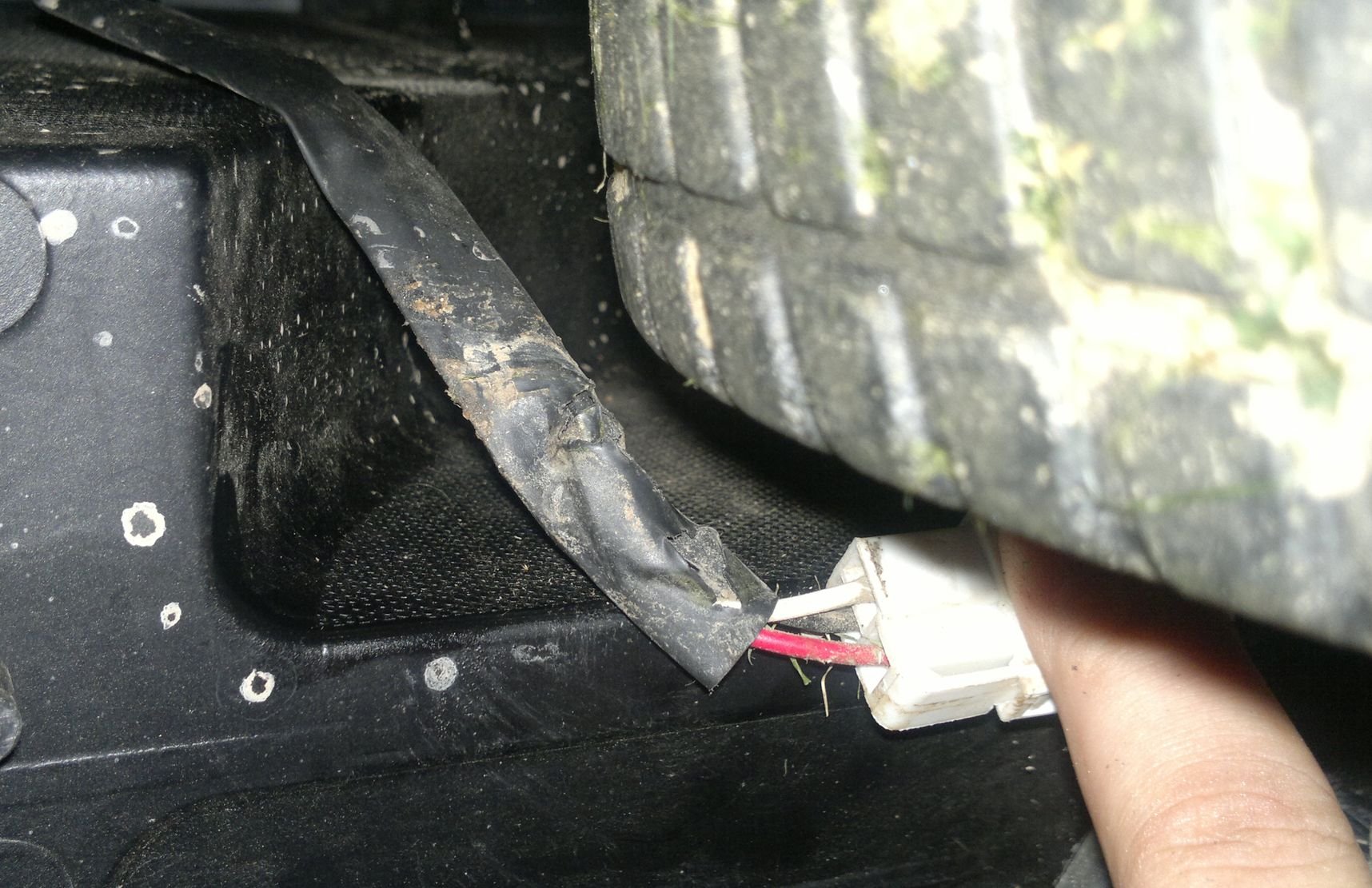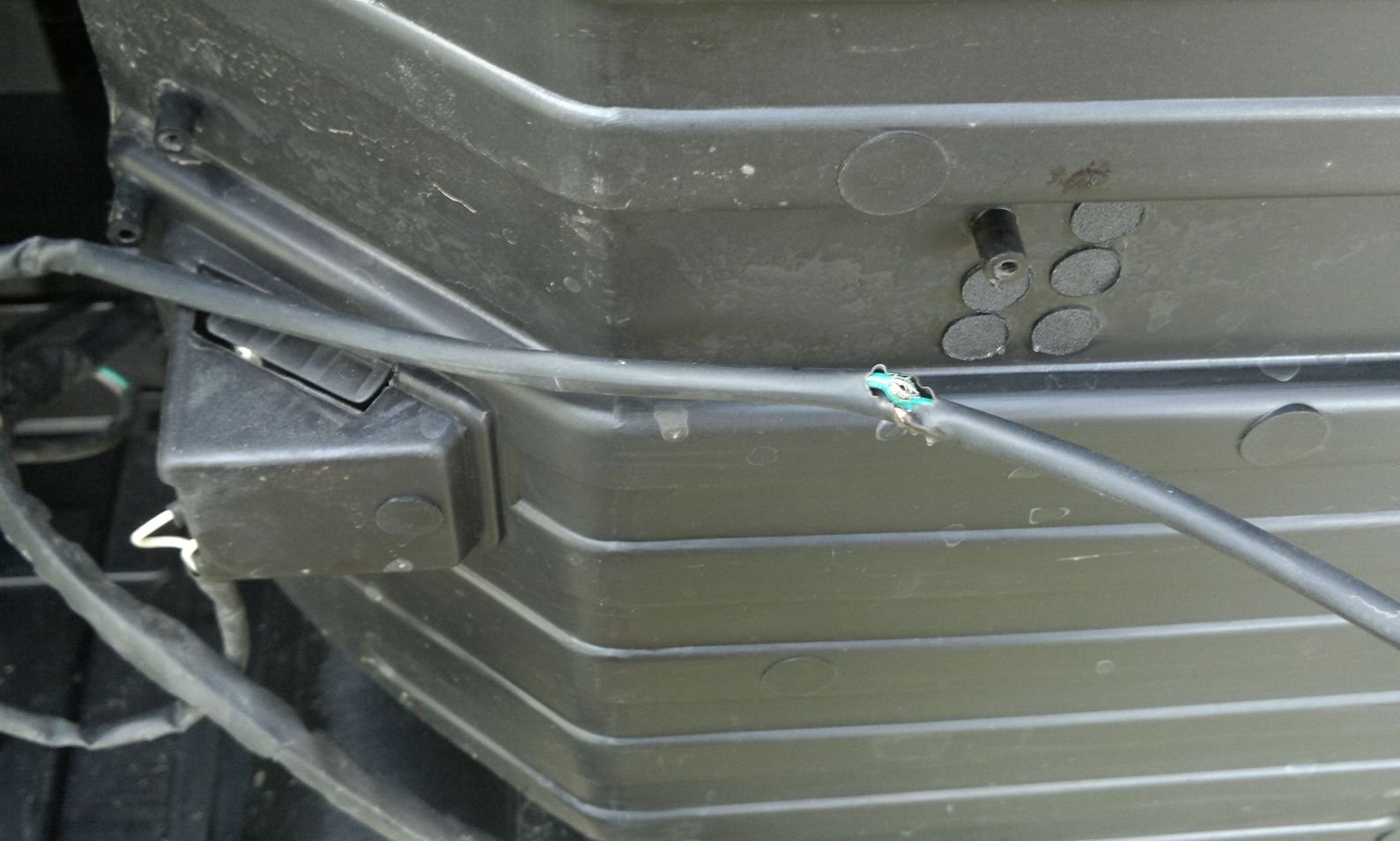 Kabelový svazek od dobíjecí zásuvky se podařilo zachránit taktak. Vůbec sem si nevšiml, že se brousí o kolo.