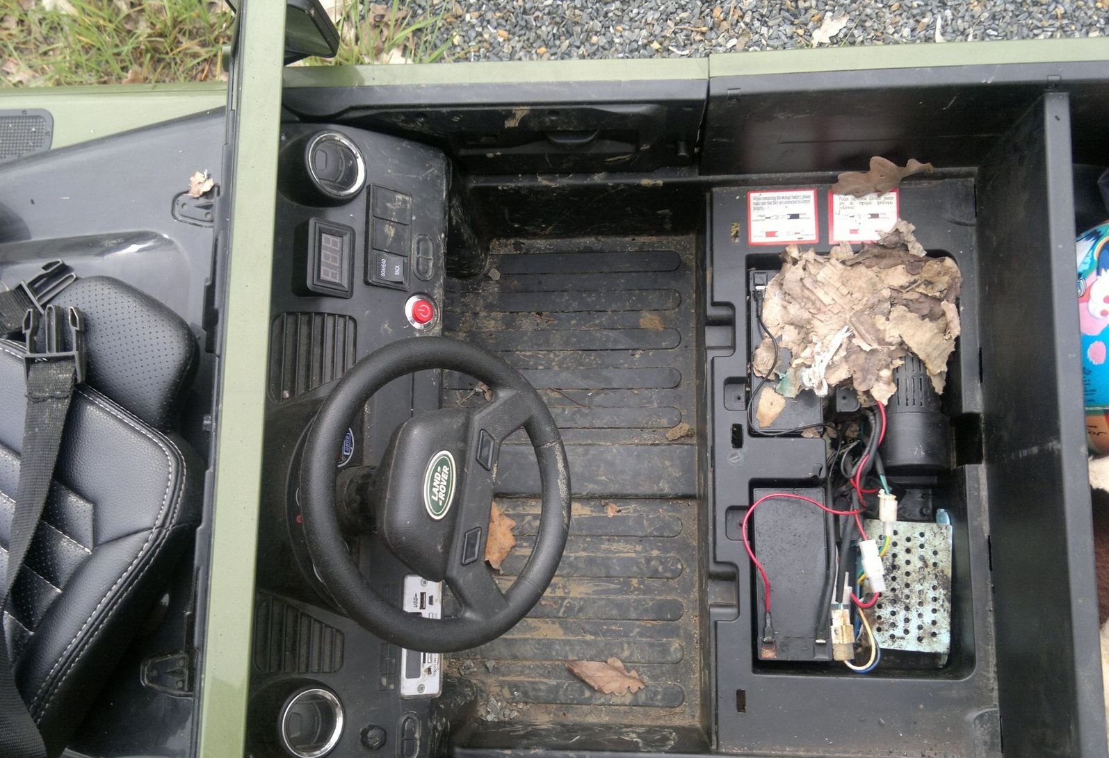 Začala zahrádková sezóna, tak bylo na čase vytáhnout ze zahradního domečku i malého Defíčka. Chci vyměnit baterky, zvednu sedačky a .... a myší kutloch pod nima :lol: