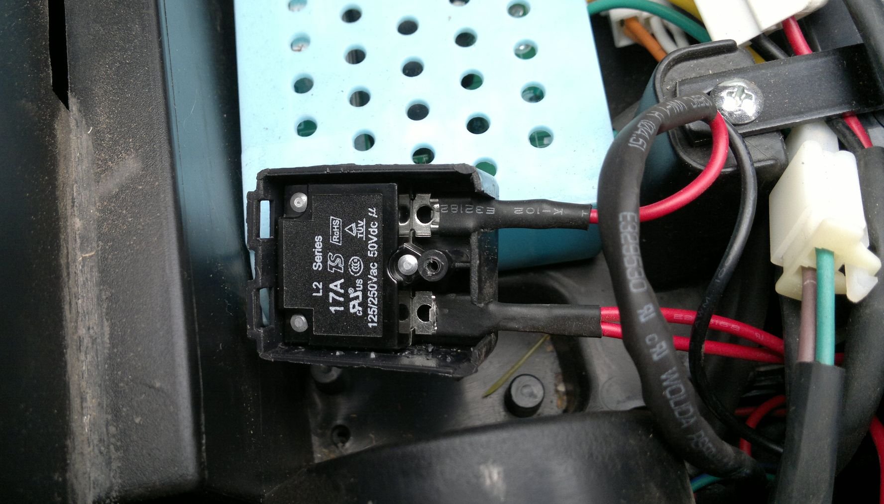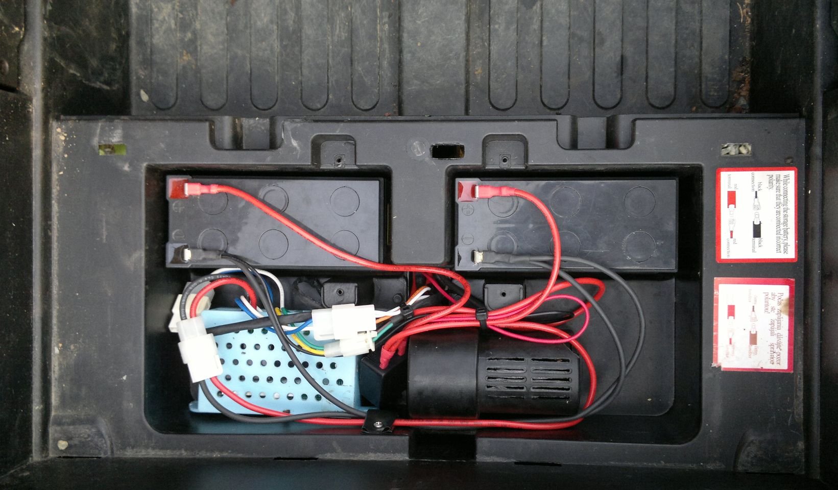 Tady už je učesaná nová kabeláž. Původní silové vodiče AWG18 (0,8mm2) vedoucí od aku k vypínači a zpět k řídící desce (a plus ty kostrové od aku k desce) jsem nahradil vodiči AWG12 (3,3mm2). Už dříve jsem na těch původních měřil za jízdy úbytky a nic významného jsem nenaměřil, takže jsem očekával hlavně přínos v mechanické odolnosti tlustších drátů. Když už jsem to dělal a byly po ruce... no ale ukázalo se, že to má sakra vliv. Defík je teď živější, hravješ vyjede kopečky na zahradě a je i vidět na palubním multimetru, že napětí v záběru nepadá tak dramaticky jako dřív. A to jsou tam pořád starší jeté akumulátory.