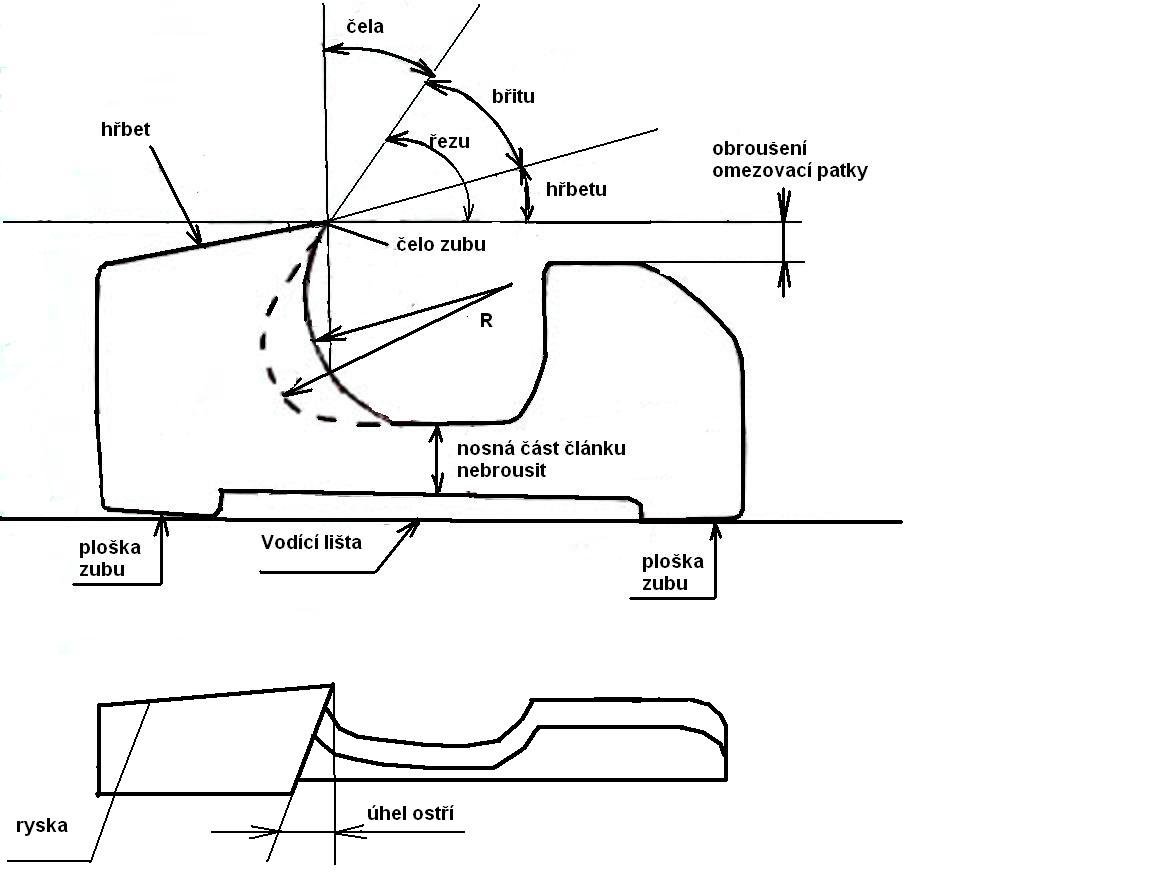 Nechcel som sa pôvodne k tomuto rozpisovať ale vidím,že to bez toho nepôjde. Prípravok ktorý ti nejaké vemeno predalo ako na ostrenie dlátových zubov pílovej reťaze ju v podstate zničí. Zuby sú totiž povlakované tvrdochromom a ten vlastne vytvára dokonalé a mimoriadne odolné ostrie. Preto sa brúsia z vnútra a pri spätnom ťahu pilníka ho máš odľahčiť aby si ho nezatupil. Geometria zuba má široké súvislosti a je vo vzťahu z výškou zuba. Je to jasné z obrázku od kolegu predo mnou.