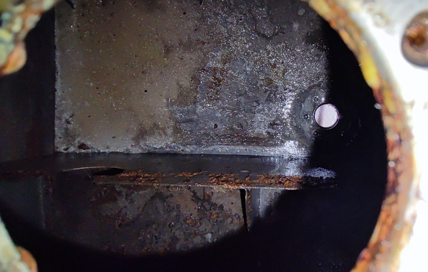 Dnes jsem vyndal plovák z nádrže a podíval se dovnitř. Ještě větší síla je, kolik bordelu je uvnitř, když jsem polovinu blíž plnícímu otvoru vypral hadicí i wapkou. Za příčkou to už není dršťková, ale spíš štrůdl. Fotka je kolmo dolů otvorem po vyndání plováku - vidět je trubička, která dole směřuje k vypouštěcímu otvoru (ten ani pod nánosy není vidět) a příčka na dně nádrže. Plus asi dvě šišky štrůdlu.