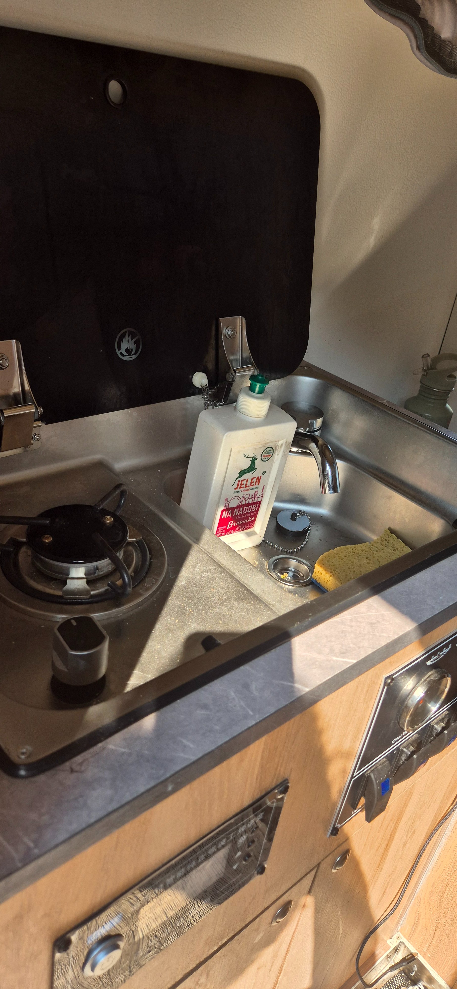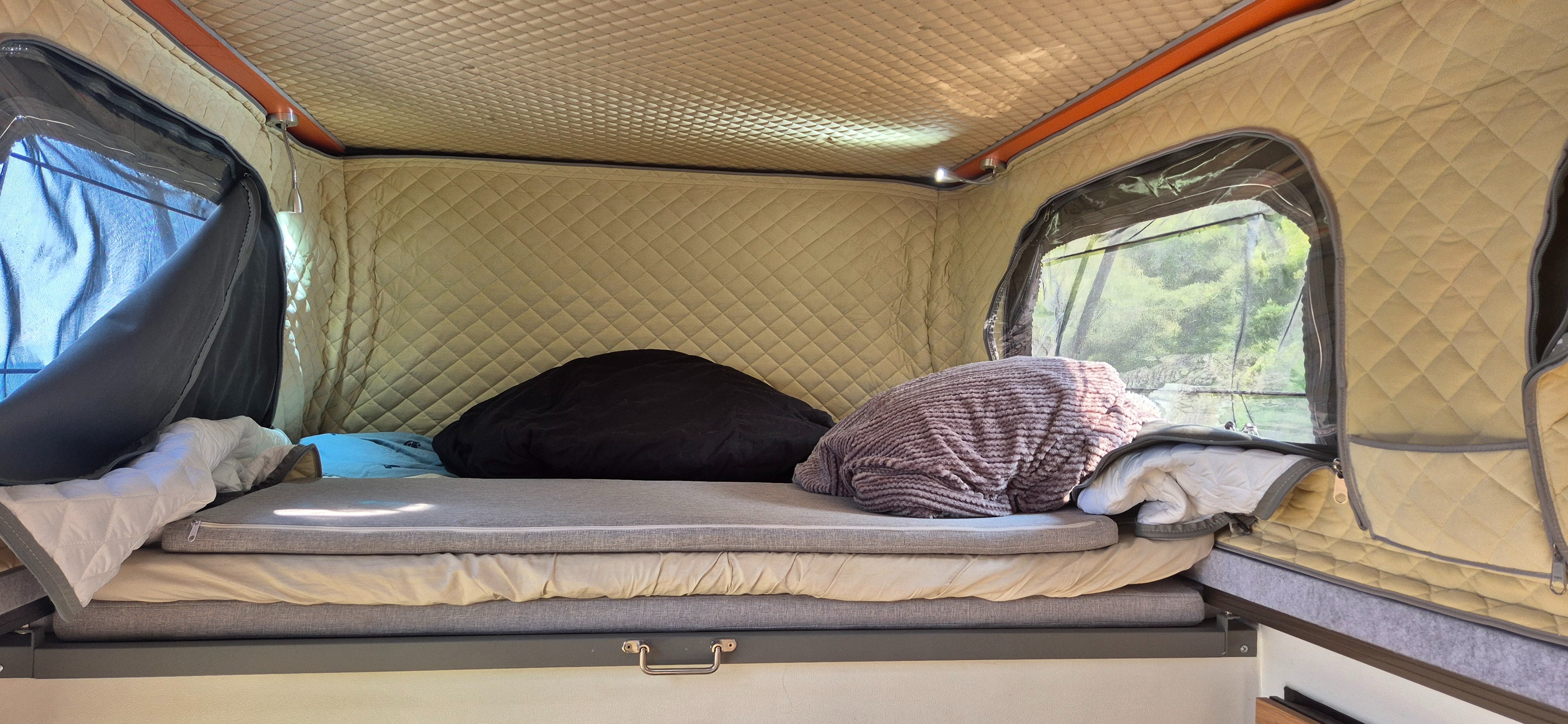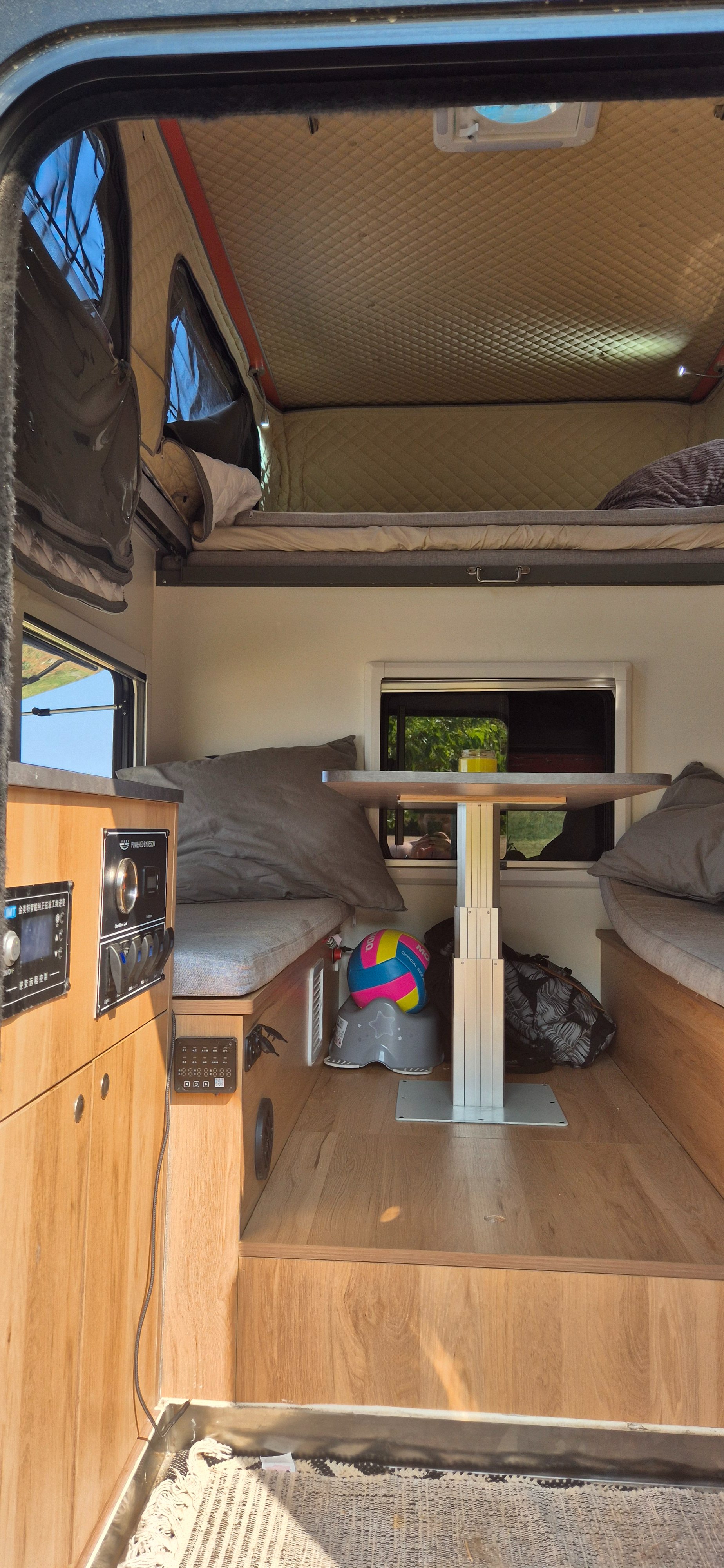 Je tam bordel. Jsme pryč. Takže jsou tam 600w solary, 200amp baterie 2000w měnič napětí. Led svetla, vetrak který funguje i jako digestoř. Postel nahore 2x1,8m druhá dole 1,5x1,8m (rozlozitelna na stul), plynový sporák s umyvadlem, vnitřní sprcha....