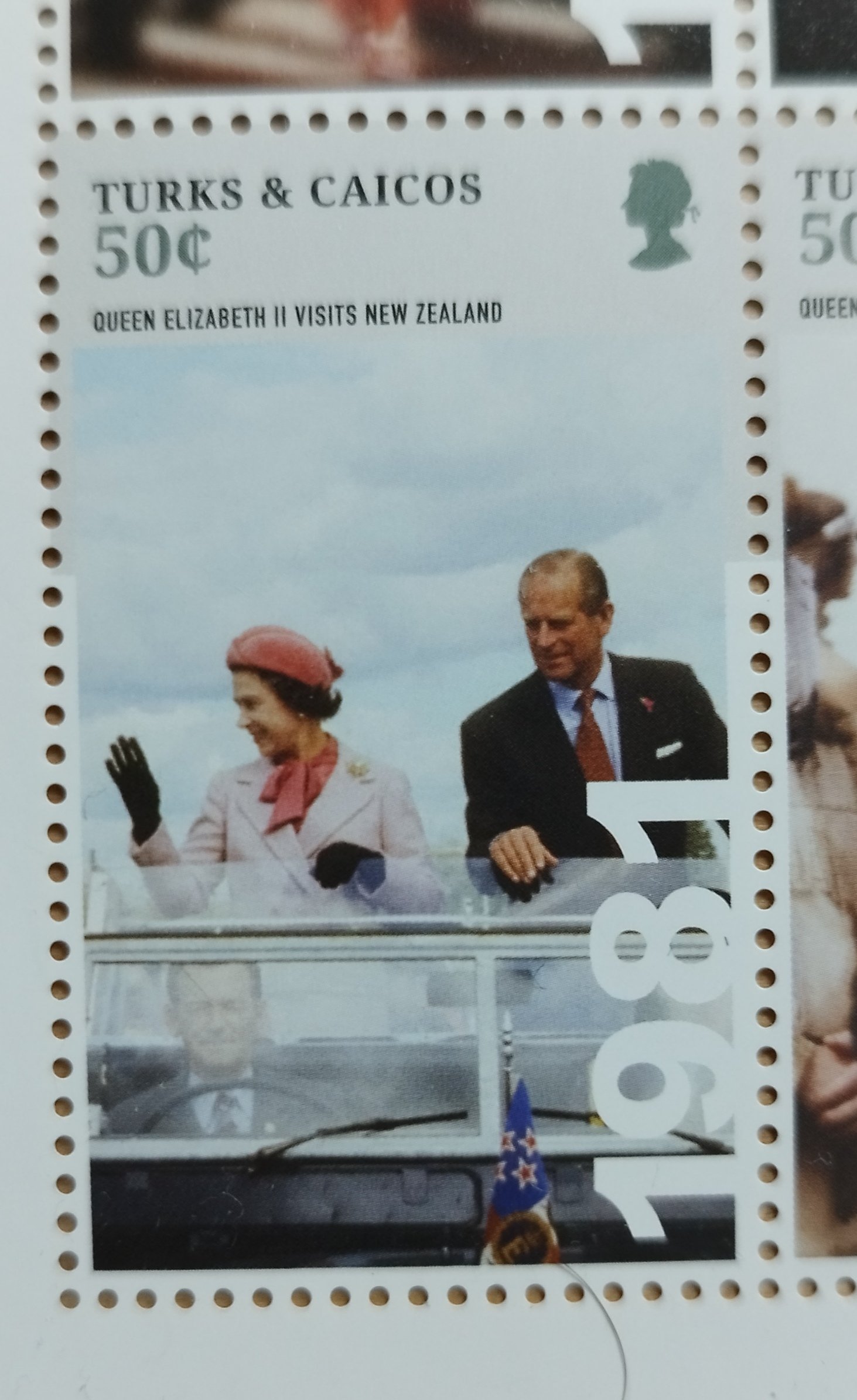 Na ďalšom aršiku z roku 2015 z ostrovov Turks&Caicos je kraľovna Alžbeta a jej rozne cesty v roznych krajinach a na jednej znamke je odfotena na LR Series I
