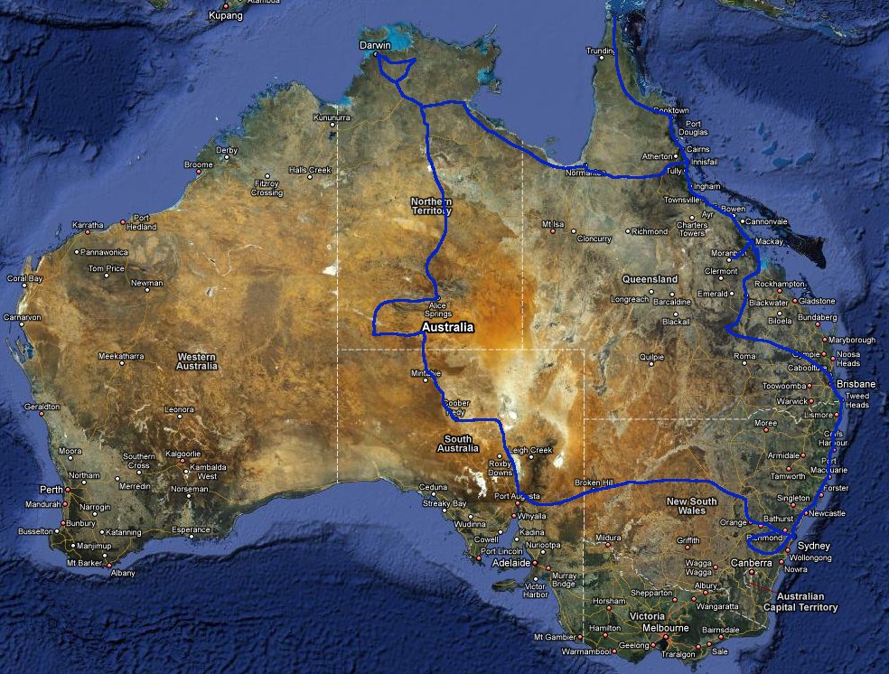 V Australii jsme byli, snazili jsme se udelat okruh viz. mapka (kresleno po pameti a "od ruky"). "Stara telegrafni cesta" kterou jsme projizdeli je na poloostrove Cape York. Kdysi tam vedl telegraf do Asie, dnes je tam polozena optika.MOPADŽI píše:Austrálii, projel sinda. Byl tam s manželkou, koupili tam Defíka 200tdi a vyrazili po "staré telegrafní cestě"...