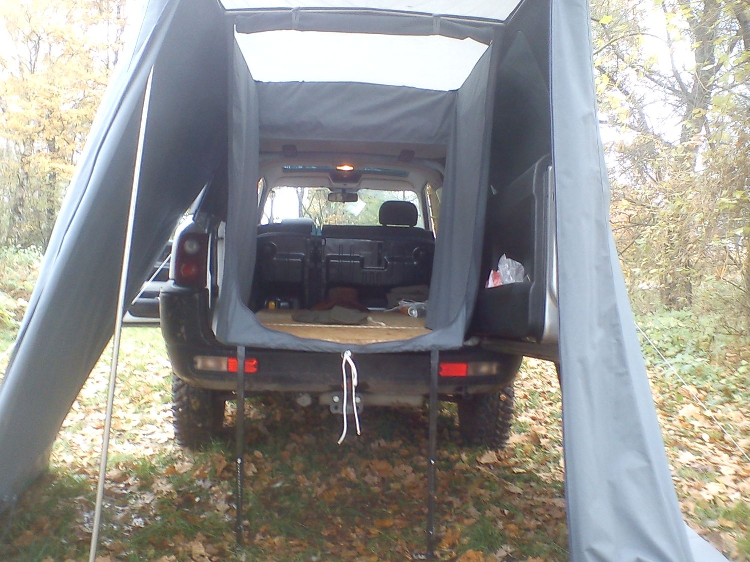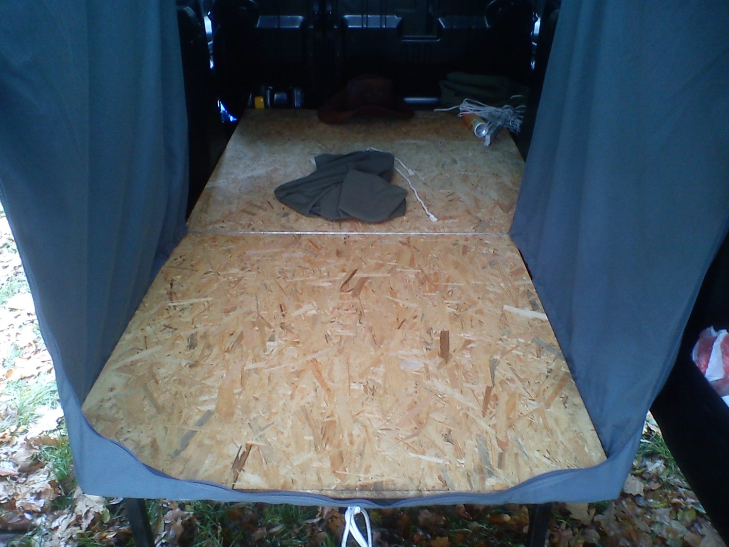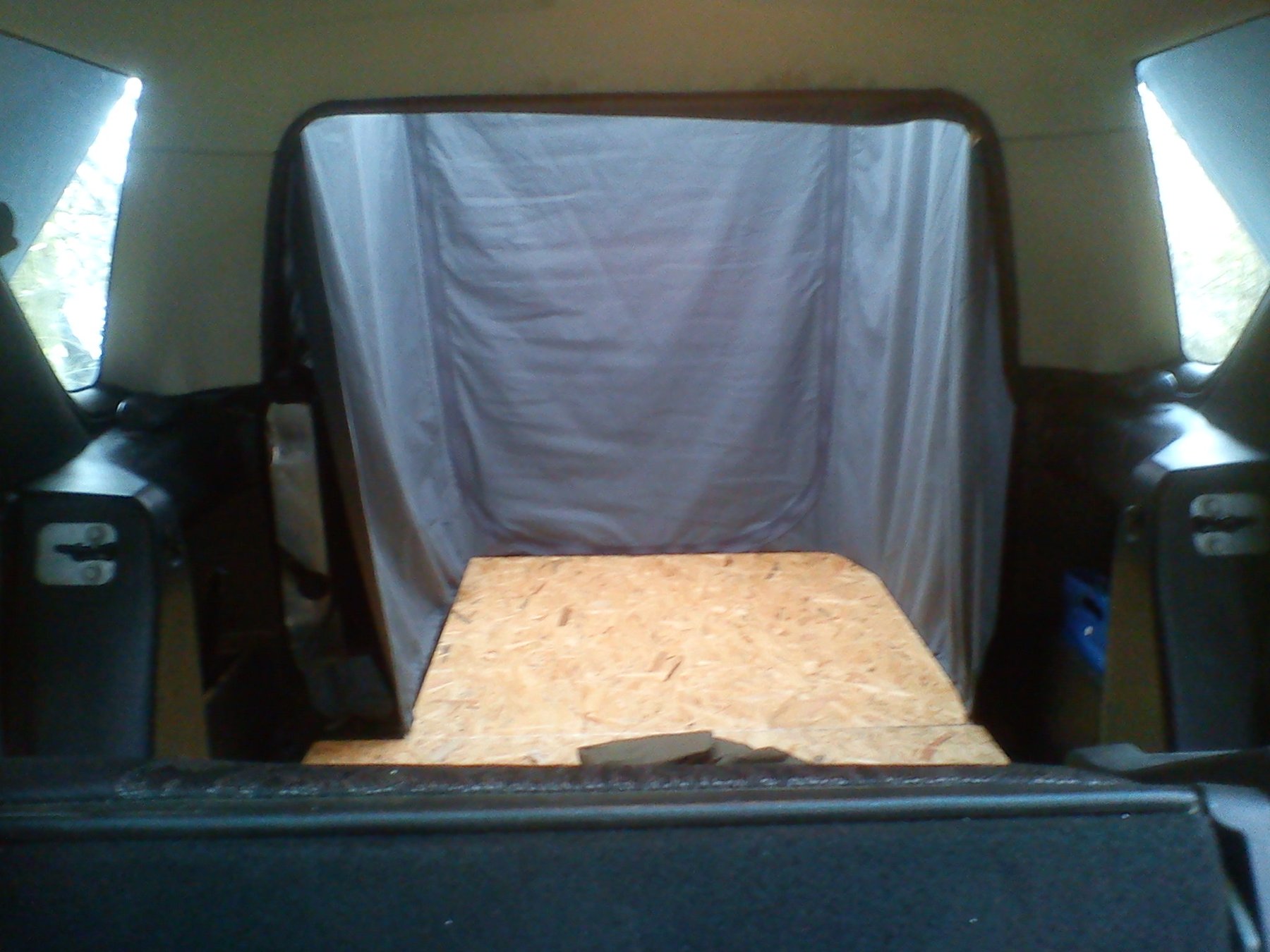 Spaní jsem vyřešil podobně jako jsem to tu někde zahlédl v diskošce. Je to rozkládací krabice v kufru a na ní molitan.