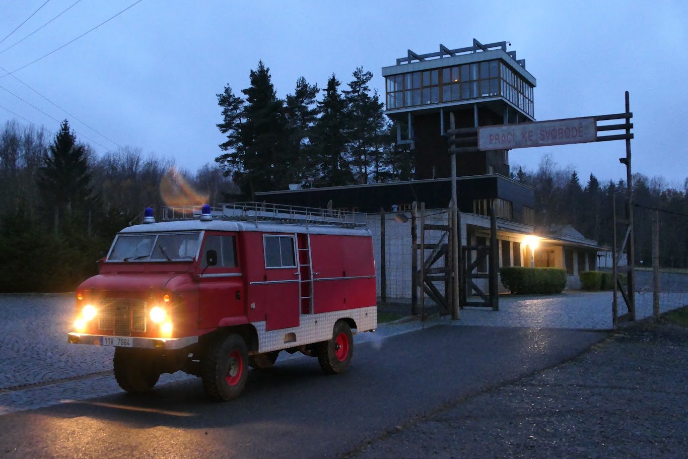 Obludě naštěstí světla fungují a svítí. Je to trošku off topic, protože slunce toho dne nějak zapomnělo vylézt z mraků, ale byli jsme se podívat v Památníku Vojna, vřele doporučuju všem, kdo ještě nebyli (i těm, kdo byli). Měli jsme výborného průvodce, zaujalo mě, když říkal, že Vojna je jediný památník svého druhu v postkomunistických zemích, nikde jinde v takovém měřítku nezůstal žádný komunistický lágr zachován (nebo jako v případě Vojny částečně rekonstruován). Vyrazili jsme tématicky 17. 11., naše prohlídka se křížila s oficiálním pokládáním věnců, což byla spíš taková rychlá akce - šup dovnitř, věnce, šup ven.