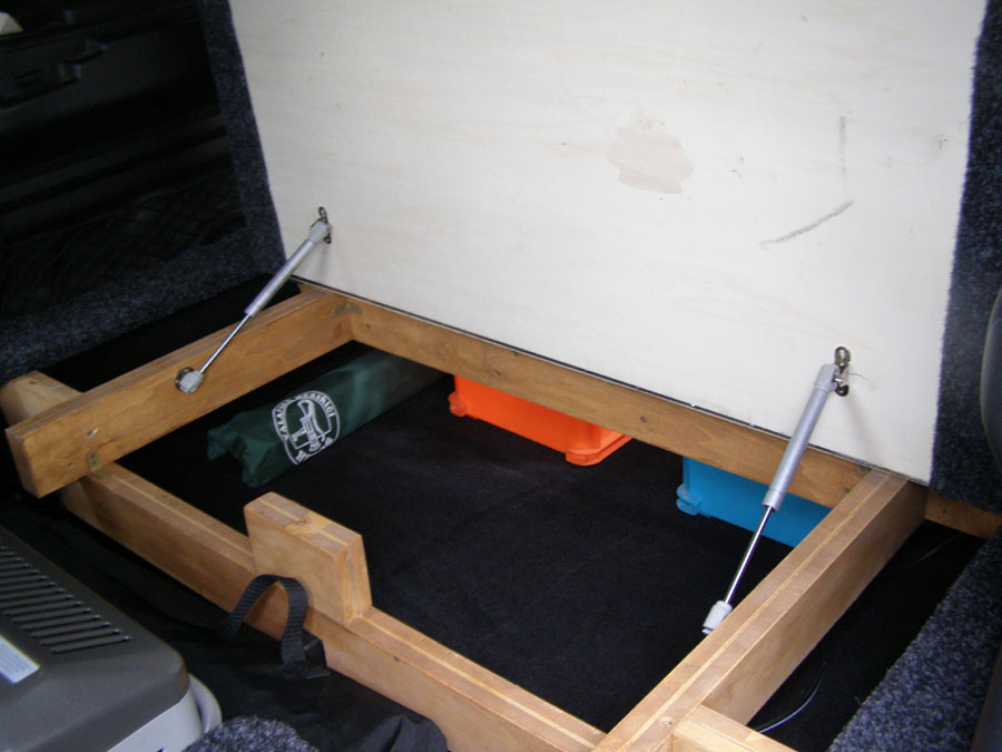 Na Romale jsem to udělal podobně. Snad ne až tak důkladně s tlumičem a polepený kobercem. Jenom jsem nechal boky volný, abych při otevření dveří mohl do úložnýho prostoru zboku. Nahoře jsme měli dostatek běžnýho denního bordelu jako chemické WC, přepravky s jídlem, vařením, stolkem, židlema a oblečením. Ty jsme vyndávali z auta na noc.