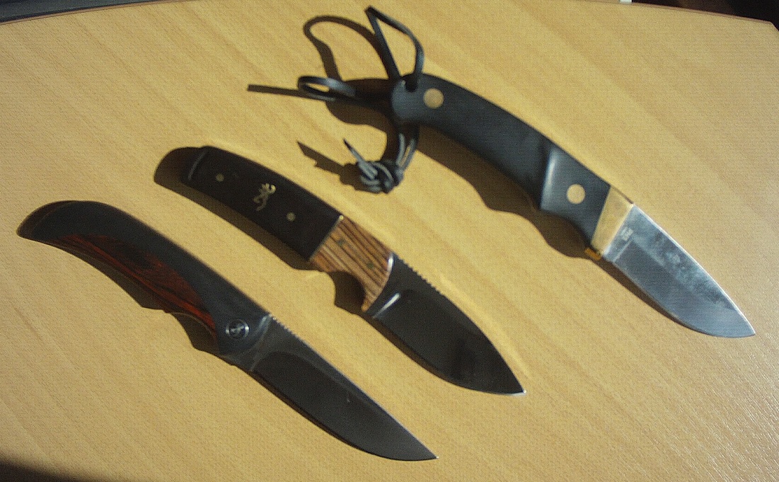 Přemýšlel jsem, co pořídit tátovi k narozkám, a na nic jsem nemohl přijít. Až paradoxně v den jeho narozenin jsem z nudy vlezl na nože-nůž a měl jsem jasno. Jelikož táta pevný nože moc nenosí, měl by to být zavírák. Hledal jsem celý večer a v mé cenové relaci nic hezkého skládacího nebylo, nebo jsem nenašel. Nakonec jsem náhodou narazil na tenhle Browning Buckmark Hunter. Je vcelku malý, což si myslím eliminovalo nutnost zavíráku, nicméně je opravdu hezký a má pouzdro kůže. Ocel, sic čínská, vlastnostmi blízká AUS-8. A když už jsem narazil na Browning, měli ve slevě Featherweighta z Japonska s opravdovou AUS-8. A jelikož není dostatečně vizuálně hezkej (v porovnání s leštěným Buck. Hunterem se střenkami se zvou druhů dřeva), musel jsem si ho koupit pro sebe
