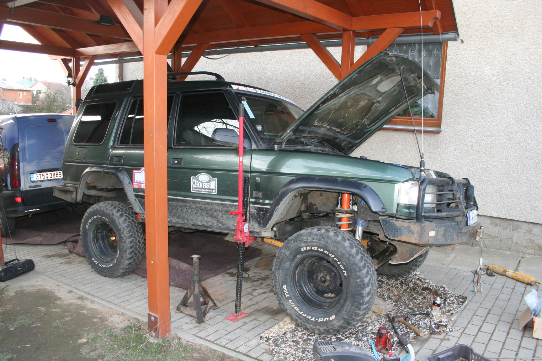 DI 300 Tdi: 4"lift, bodylift 2,5cm, BFG MT 285/75 R16, pevnostní nárazníky, prahy, přídavné světla, snorchel, CB, 2 navijáky, roll cage, kryty dif., žebřík, nájezdový plech, axle lock, true track, bufík atd