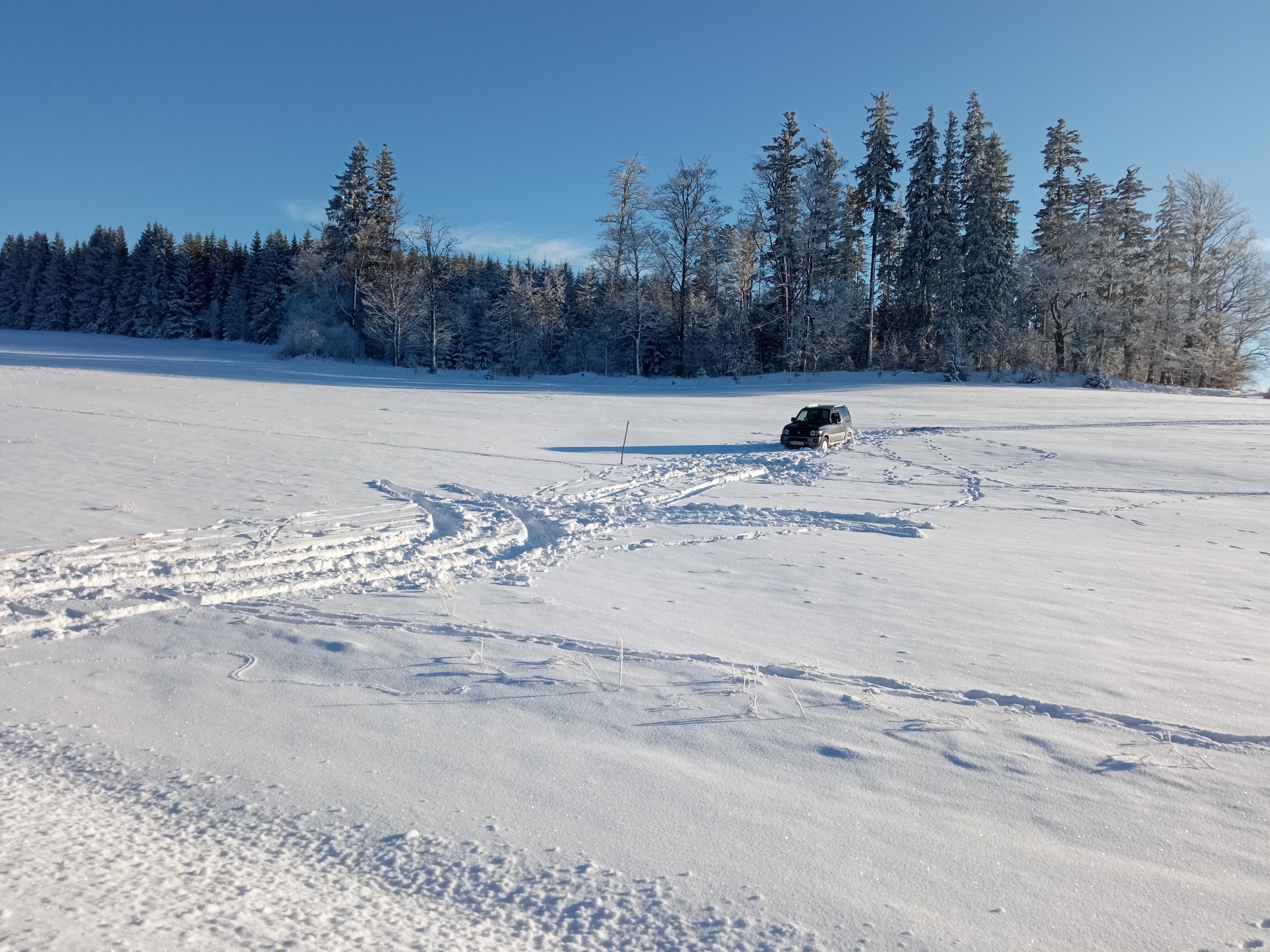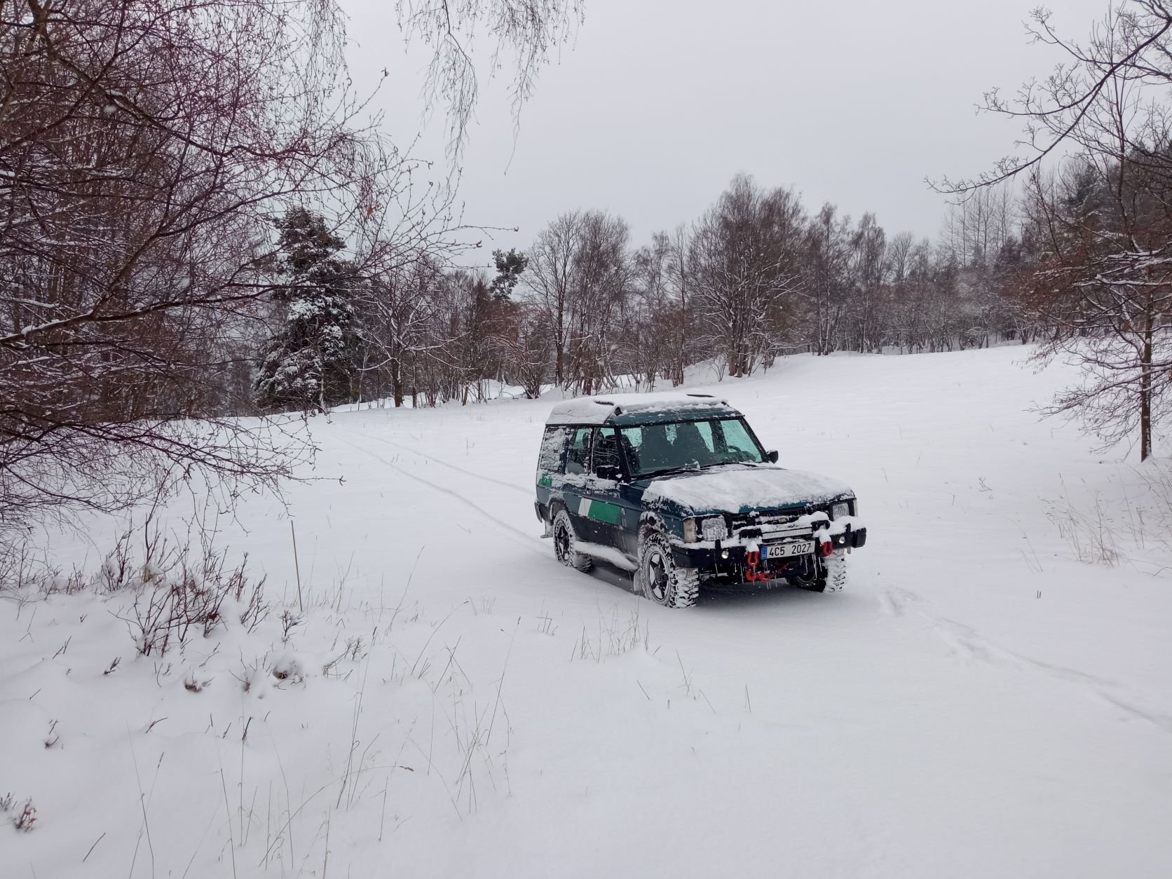 Tak si takhle jedu a koukám, že v louce je zapadlej jeden prcek. Ŕíkám si tak mu pomůžu a vlít jsem k němu do sněhu, no byl tam zaprdlej v závěji. Nedostal jsem se až k němu, tak jsem se prohrábnul co nejdál, vyndal lázo z navijáku, nastartoval, přidal plyn a začal jsem ho z toho vytahovat. Pohoda žádný velký navíjení, sníh nebyl až tak hlubokej a ten prcek taky moc neváží.