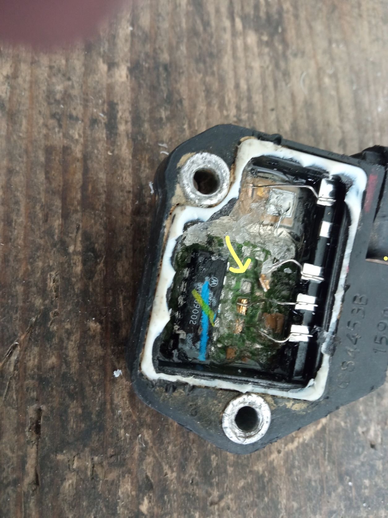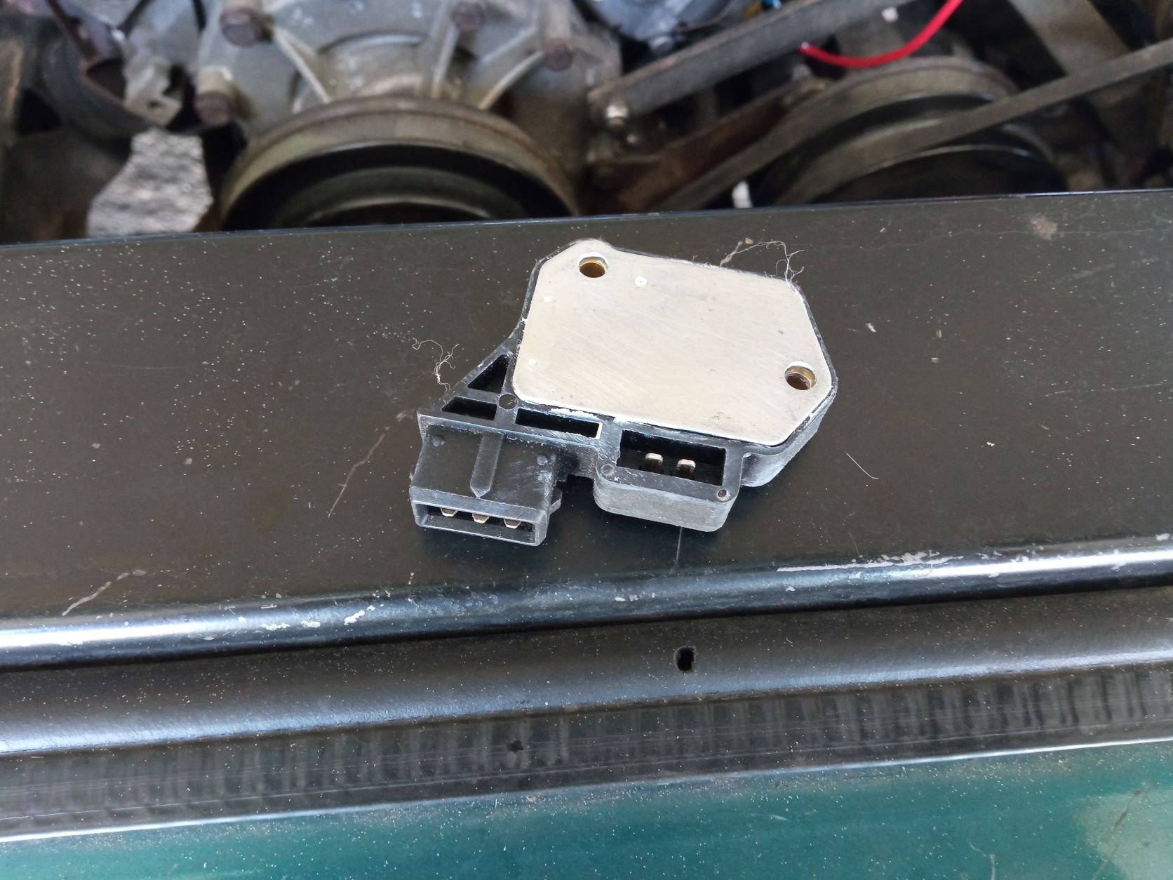 No dobrá, přehodil jsem jen samotnej modul, auto sice chytlo, ale na prd, chcípalo zlobilo... Hodil jsem tam stroboskop, abych viděl jestli jde jiskra, no naprd, přehodil jsem zase starej modul, ten chvíli šel a nebo nešel, takže přehazovačka tam a zpět jeden rozdělovač, pak převod z jednoho rozdělovače na druhej abych měl stejnou polohu palce.... snímací cívka tam a zpět, až jsem si to celý rozjebal na rozvodech a musel jsem jít od základu - značka na řemenici a palec nastavit na první válec... no nervy začínaly téct. Motor několikrát uchcanej, nový svíčky a stále nic. Tak jsem chyt ten starej modul a vykuch jsem mu kryt, lehce jsem jehlou ťuknul o přívody a ejhle, jeden drát se zvednul. Vůbec tam nedržel na plošňáku, tak jsem byl doma. No oprava by byla na 5 minut s pájkou, ale protože to je zajebaný tím polotekutým silikonem, tak je to neopravitelný. Ten modul z novýho rozdělovače je taky v háji, ale abych měl jistotu, mrknul jsem do šuplíku, prdnul jsem tam napřed na stole MOSFETa tranďák jen tak na hulváta jestli to bude jiskřit a jiskřilo, tak jsem to prdnul i s tím hulvátem do auta a motor chytil na brnk.