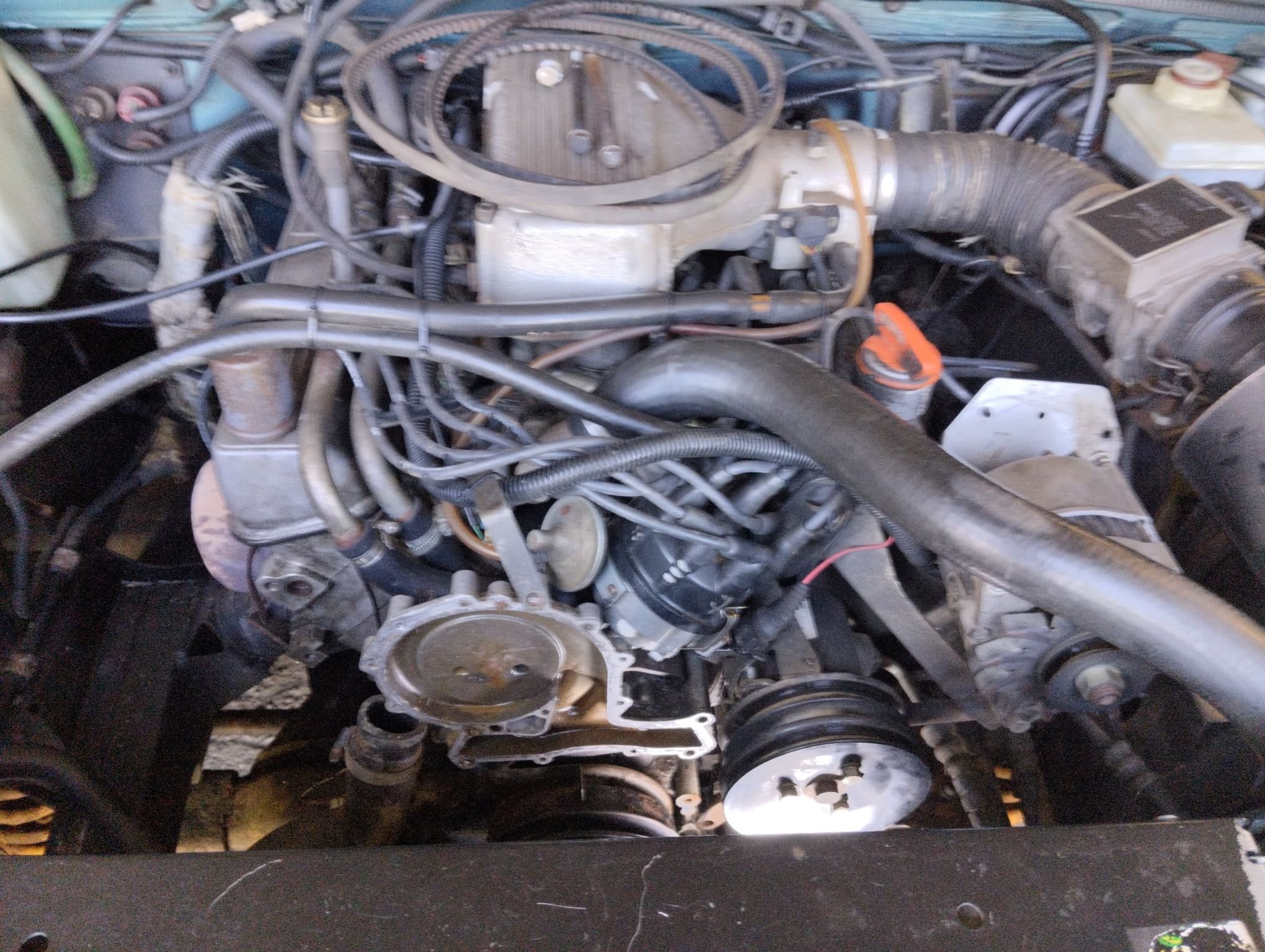 Ještě jsem měnil vodní pumpu, páč tam občas vrzalo ložisko a vzadu je vidět otočená hadice s jakou jsem chvilku jezdil, když rupnul výměník. Pacahatel - trubička je taky zvěčněná.