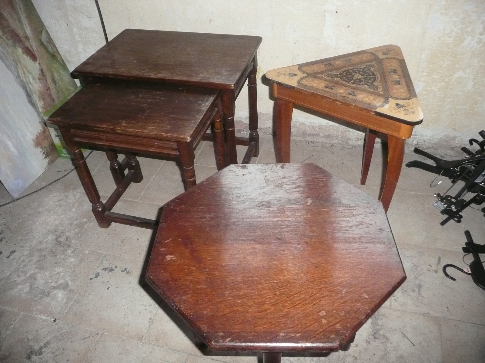 3x stolek, jeden se skládá ze dvou,cena 650 kč, druhý trojúhelníkový , cena 550 kč a třetí víceúhelník, cena 500 kč.