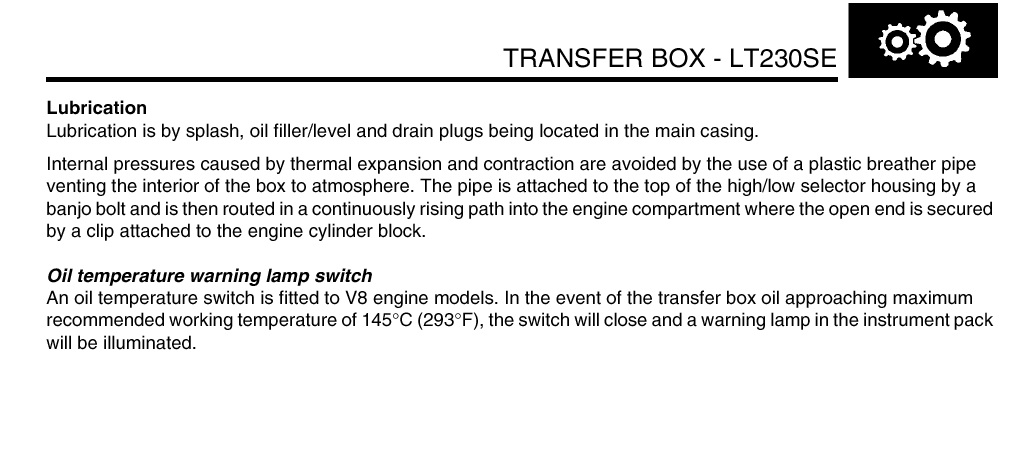 zřejmě to tak bude , když to píšou v manuálu , Možná že je to taky jeden z důvodů proč v Austrálii nebo v Afganistanu , a i jinde u arabáků , kde je často i 40°C jezdí Toyoty a Def. tam skoro nikdo nechce. A při těch teplotách by ta převodovka na Def, měla tak 190°C ./ Na převodovce i diferenciálu u mé Toy. HZJ 70 po cca 200km , Praha-Brno udržím ruku aniž bych se popálil./ Ale už dám pokoj a studený