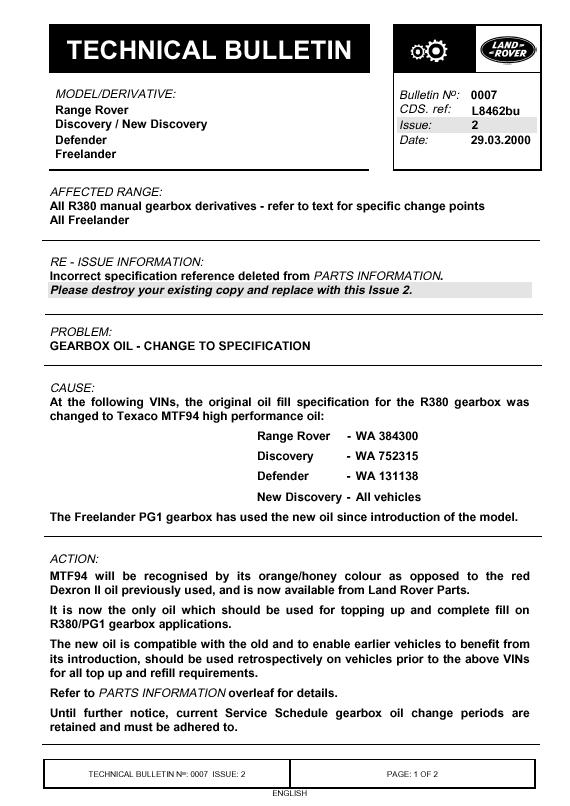 LR TSB ohladom zmeny oleja v R380 z Dexron II na MTF94
