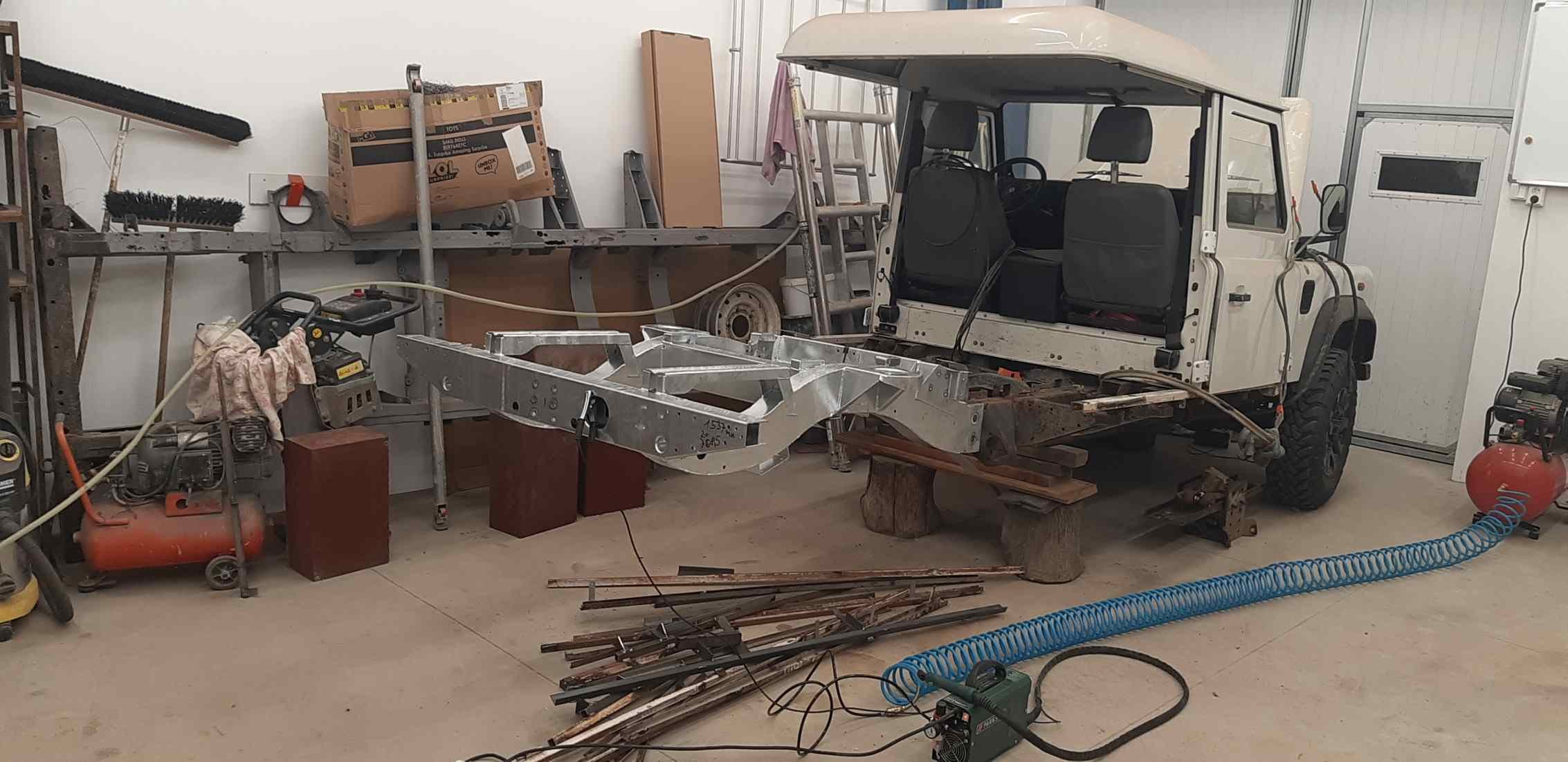 Opět jsem se trošku posunul - zkušebně jsem to složil, než půjde vše možné do zinku, aby bylo jasné, zda to pasuje. Samozřejmě že nepasuje, takové 1cm rozdíly v rozměrech mezi starým a novým koncem rámu mě už nerozhodí. To se celá bouda na autě nesedí uprostřed, ale o skoro centimetr je posunutá, to jsem nečekal, ale co už, takto jsem to dostal, předělávat to nebudu. Nakonec jsem si vzal vodováhu s laserem, že zkusím korbičku vyrovnat vůči zbytku auta. Po půl hodině měření, kdy nesedělo vůbec nic, ani tak korbička není pravoúhlá, jsem přešel z rozlišování milimetrů na toleranci 0,5 cm a najednou vše sedí. Prostě defender. Ještě složit a namontovat na auto zadní nápravu a mohu to začít znovu rozebírat. Je to celkem jednodušší, když jdou šrouby normálně povolit, oproti tomu, když se musí utrhnout, uříznout nebo odvrtat. Rozborka zadní části kabiny zabrala asi 2 dny ve dvou lidech, složil jsem to sám za 2 hodiny.