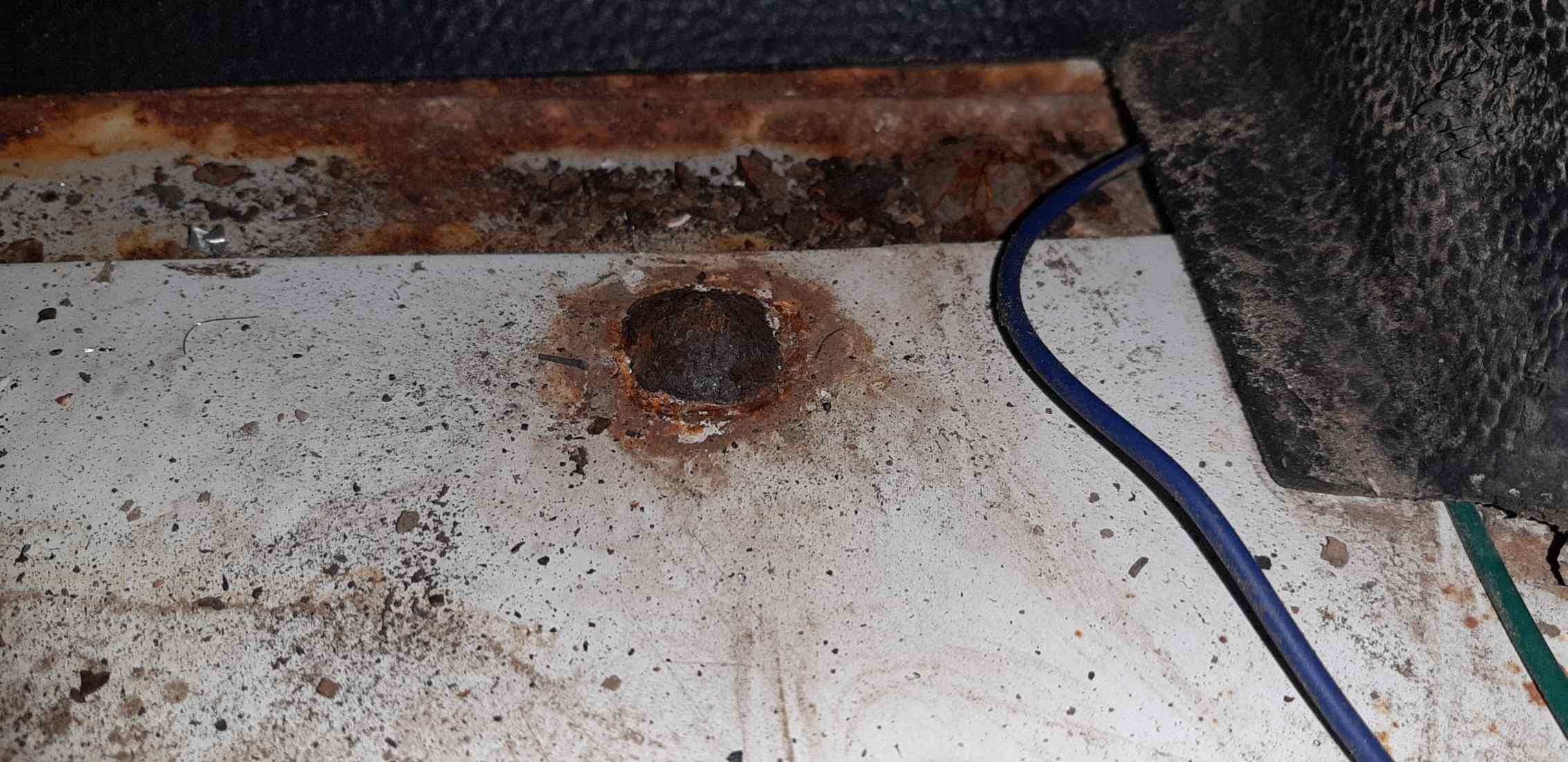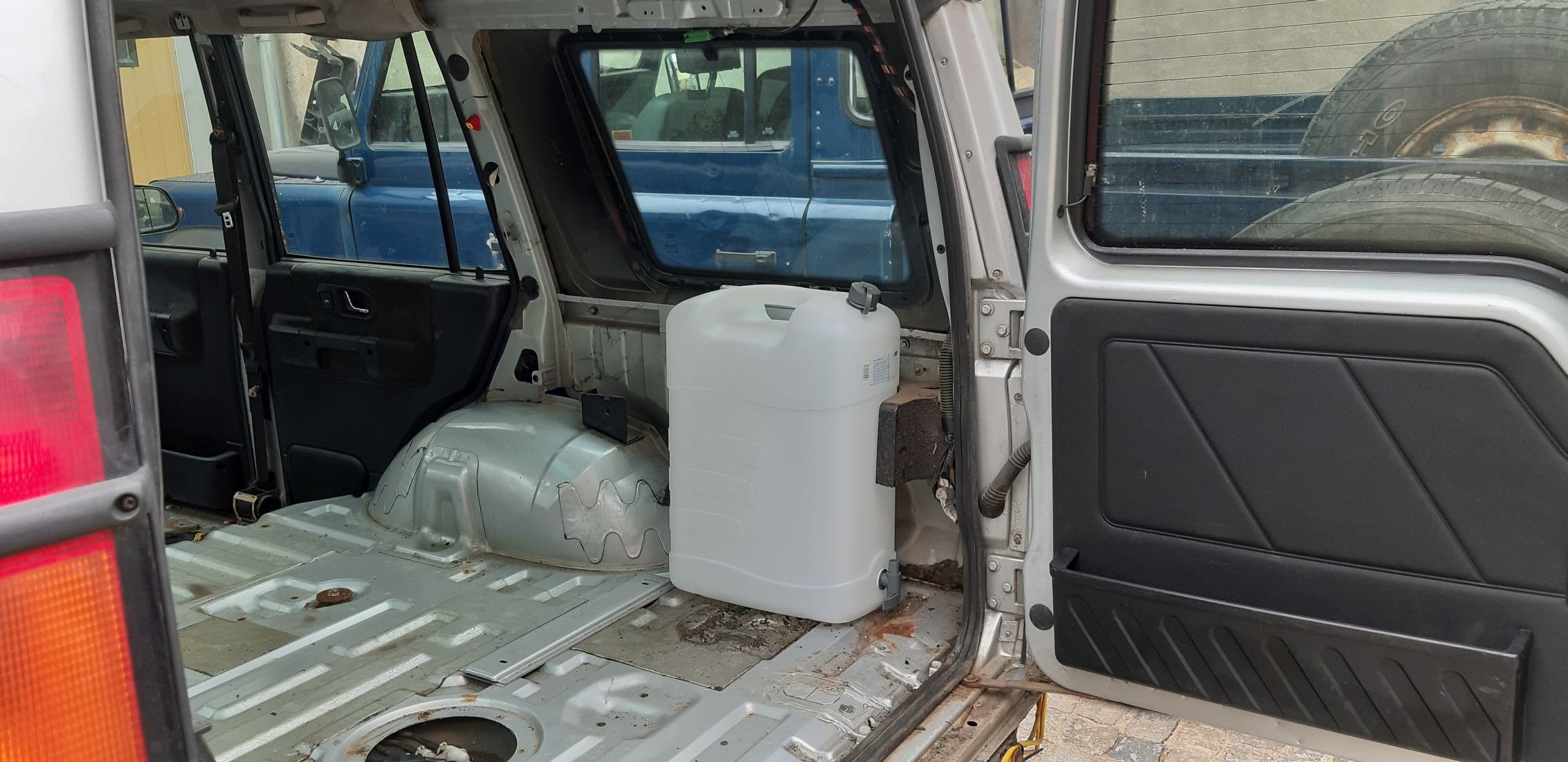A protože jsem se rozhodl, že v naší zelené výletové D2 doplním nádrž na vodu, tak jsem vykydanou stříbrnou rovnou použil jako demo, jestli se tam ten kanystr rozumně vejde - vejde, sice bude kousek koukat, ale to nevadí. Má 35 litrů, to je to podstatné. Do stříbrné vodu řešit nebudu, zatím je jako správný LR samozalévací, myslel jsem si, že tam teče přelepeným rozbitým okénkem, a ono ne, ono tam teče střešní oknem - ucpané kanálky pro odtok vody v kombinaci s neexistujícím těsněním mezi oknem a střechou. Už jsou obě venku. A protože tam teče už déle, tak si voda našla místo pod ipou nebo co to bylo, nalepenou s výroby na podlaze a podlaha prorezla zevnitř auta. Holt pod to ipou to bylo jenom v základové barvě, stříbrná byla až přes. Naštěstí to vypadá, že prahy vyhnilé nejsou.