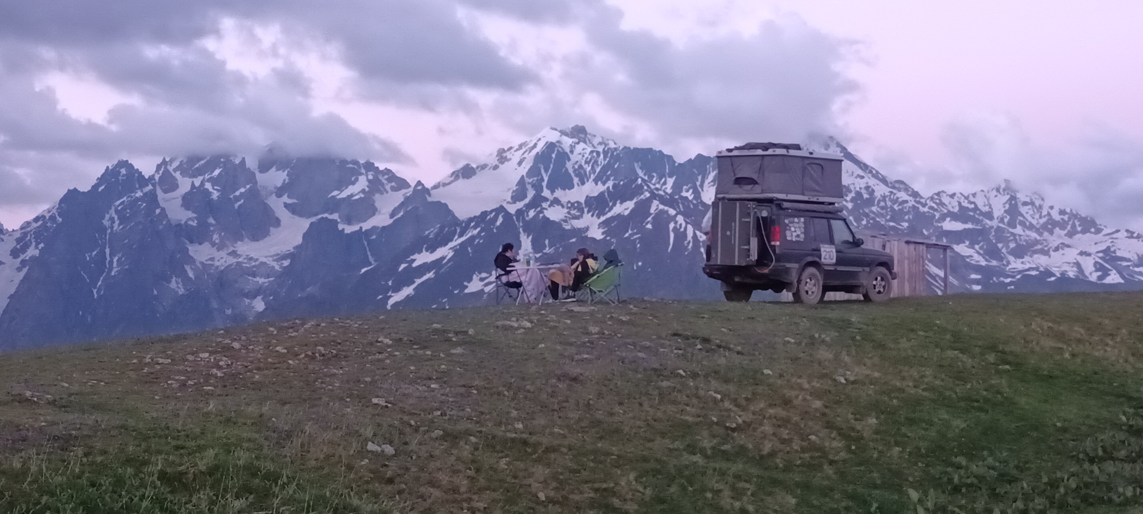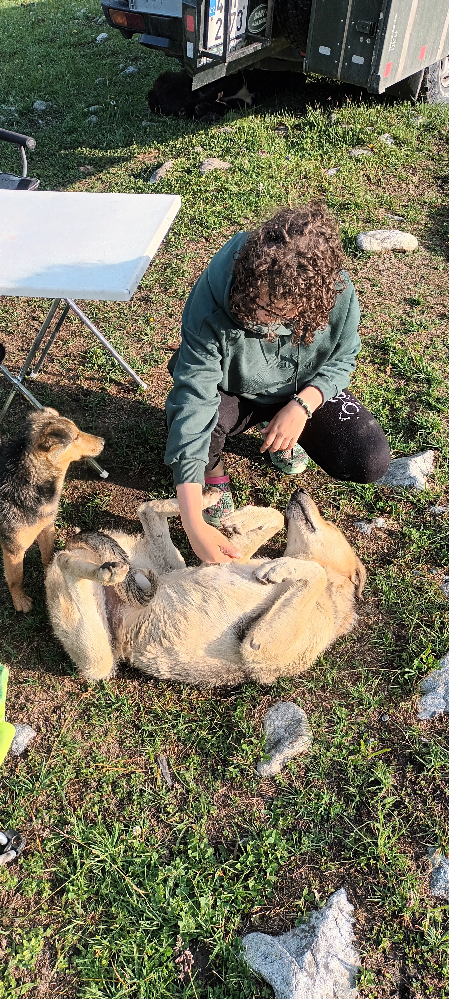 Včera jsme se přesunuli k Ushguli, pod ledovec Shkara. Kemp až na konci cesty, v noci nás hlídalo 6 psů. V dešti se schovali pod auto a ráno nám za sušenku udělali průvodce k ledovci.