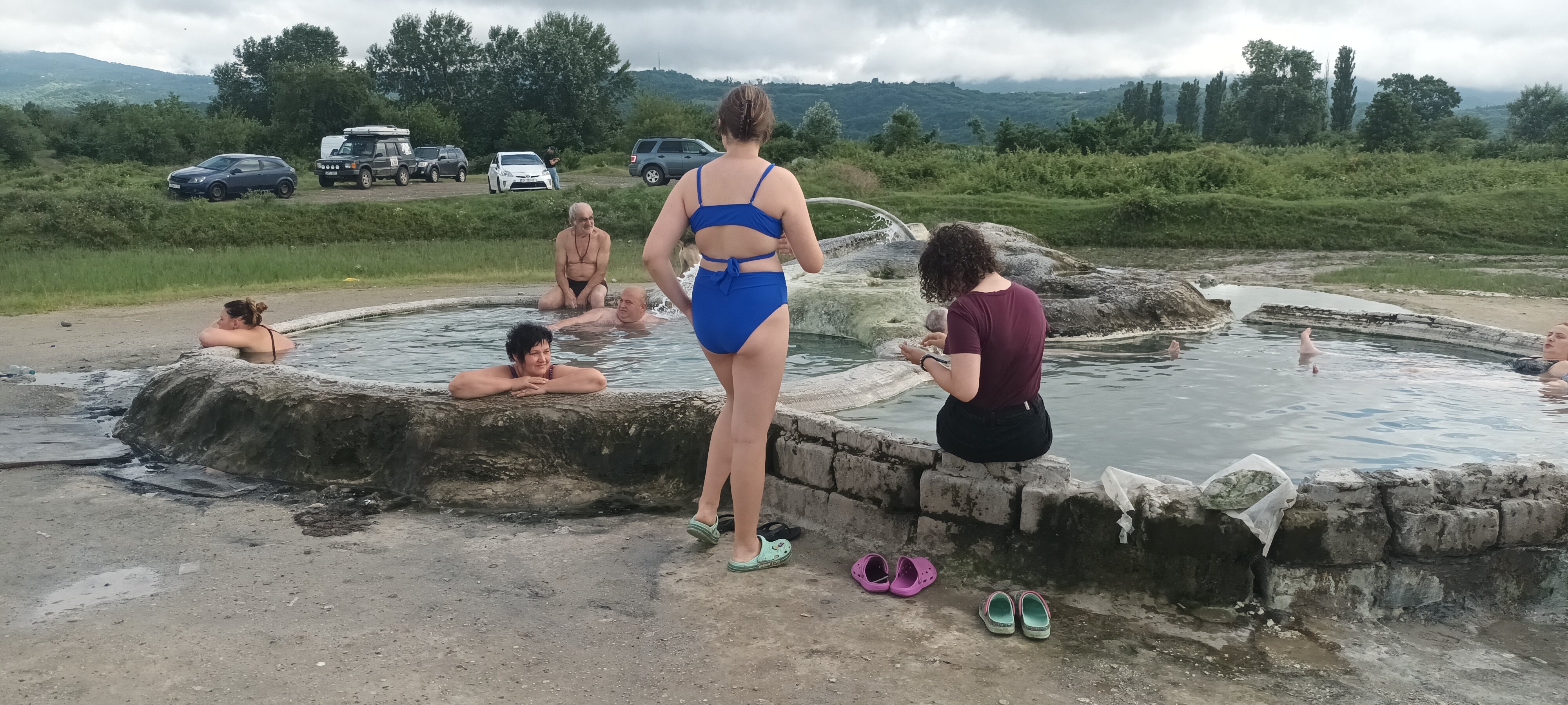 Včera kaňony Okatse a Martvili, večer potom horká lázeň v sirným prameni a chlazení se v řece. Bohužel tady dost prší, takže tam kde včera byla říční pláž s bazénky horké vody, bylo ráno asi metr valící se hnědé říční vody.