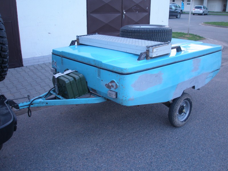 Druhý Skif je v originál stavu. Cca rok stará STK. Pojízdný a funkční. Stan je také v pořádku - barva modro-oranžová. Předsíň s tyčemi a schůdek je k tomu taky. Tento má ještě odjímatelnou vanu do vnitřku vleku při využití jako nákladní vlek - na trávu, písek, dřevo atd. Použil jsem ho jen několikrát. Koupil jsem ho hlavně jako budoucí zdroj náhradních dílů a pro případ, že bych zničil stan, aby byl druhý do zálohy. Krom zahrádky z víka, kterou jsem použil na první Skif, jsem na něj nesahal a je originál, jak jsem ho koupil. Drobné odřeniny a místy lehká koroze.