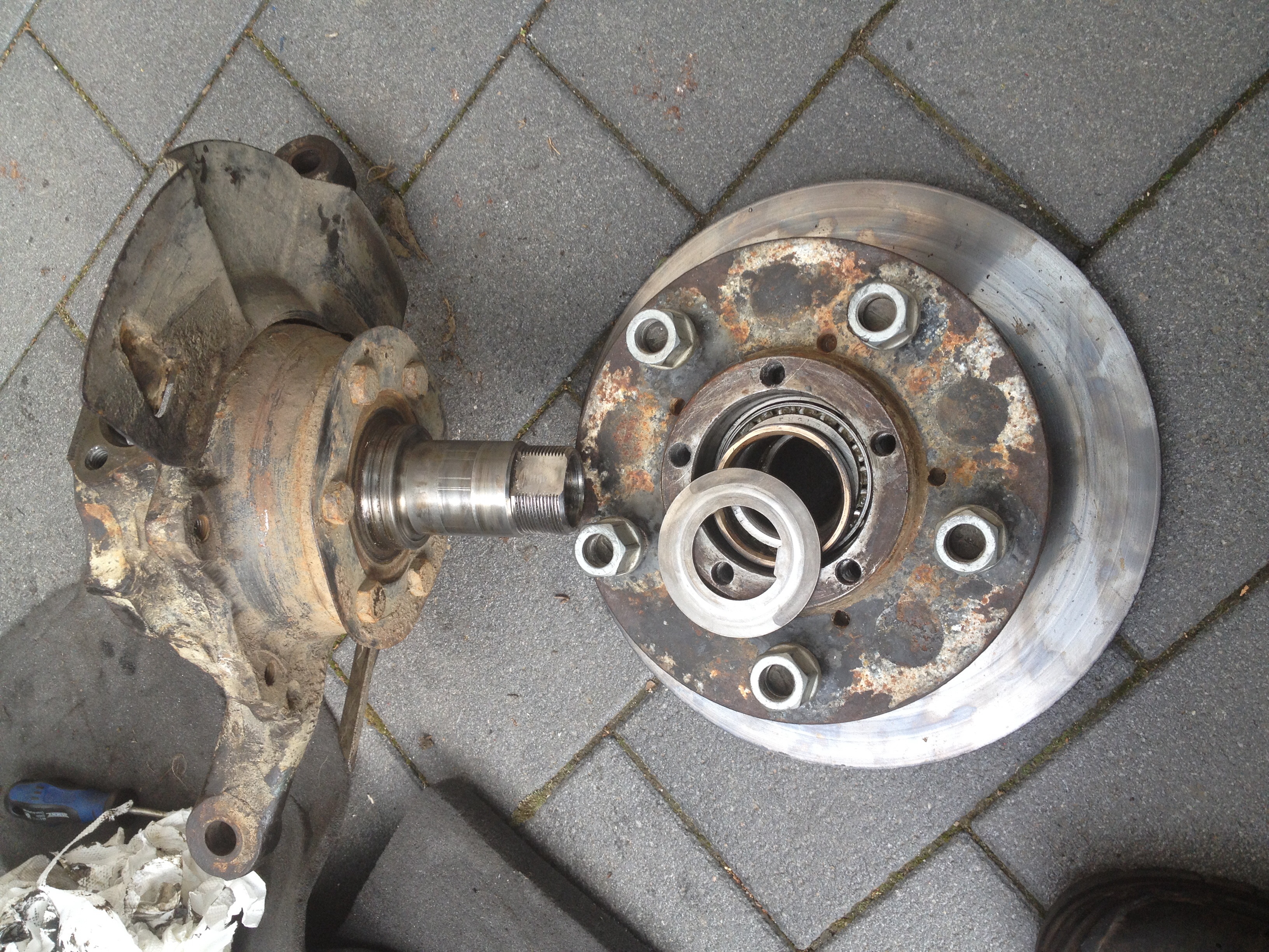 Obvykle staci poklepat po brzdovom kotuci a cele to povoli. Ja bezne tu podlozku vyberam dvoma magnetmi vtedy sa nesprajcuje (srubovakom sa sprajcuje). Loziska na naboj idu pomerne lahko tak by nemali byt kusnute.