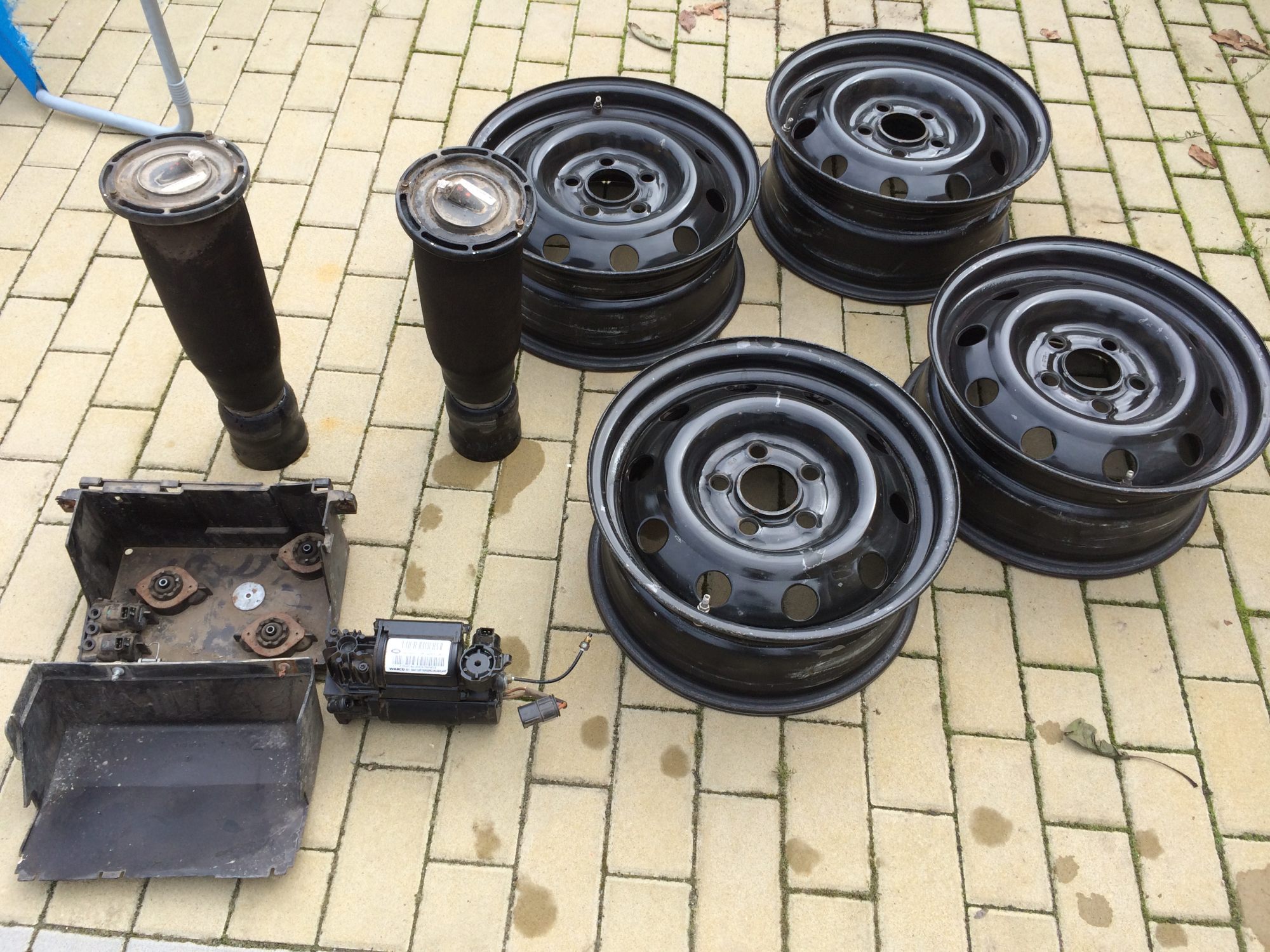 Nabízím na D2: opískované a nalakované origo plecháče, zadní tlumiče Britpart Celullar Dynamic standard - 2500Kč (namontované a po pár km vymontované), kompresor plně funkční, měchy Dunlop ježděné tak 20tis. km. Cena dohodou. Tel: 777810984